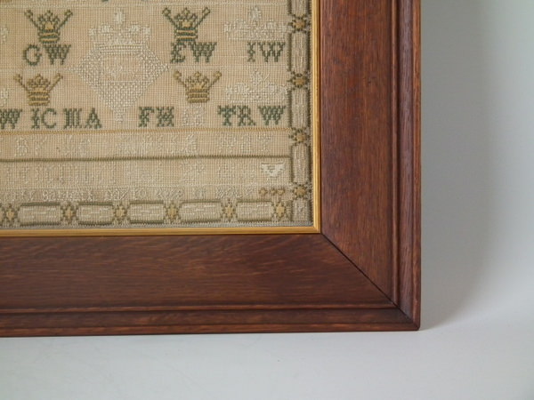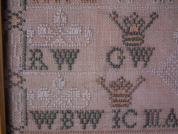 William IV, dated 1831. 13.25ins by 9.75ins wide. 1831 Silkwork crown (could be Commemorative of Coronation of William IV - date fits) sampler by ????la Watson. Framed in an old wood frame with gilt slip and glass.