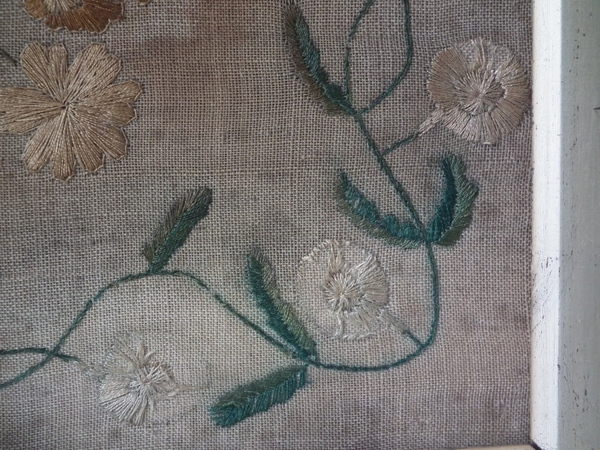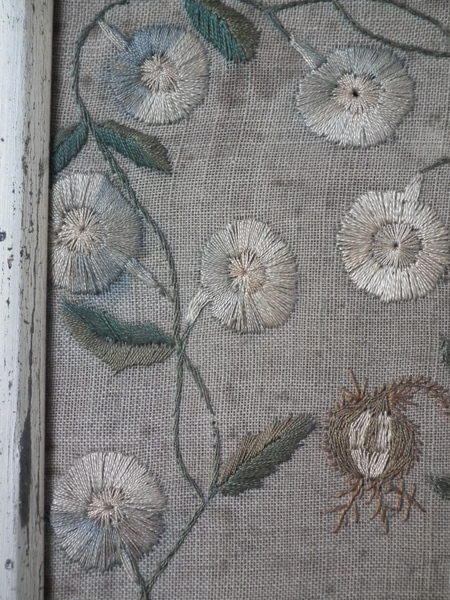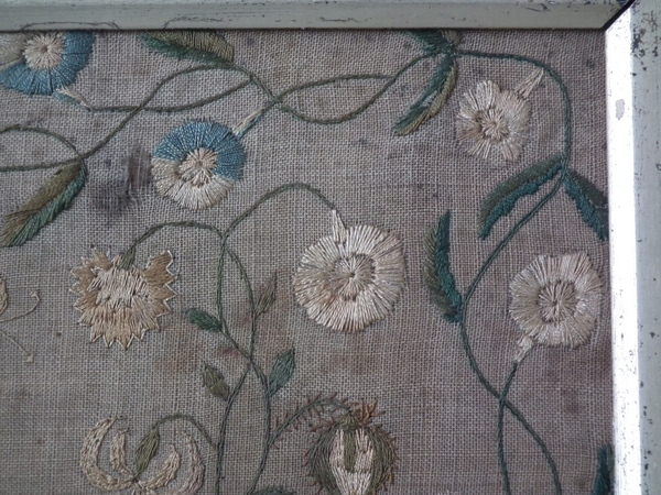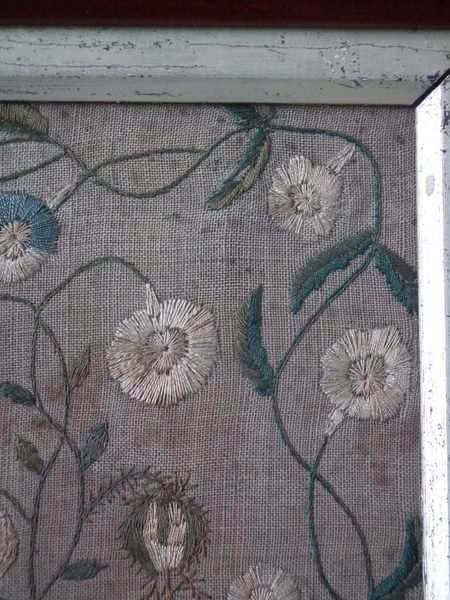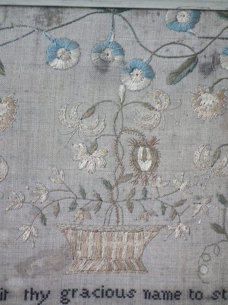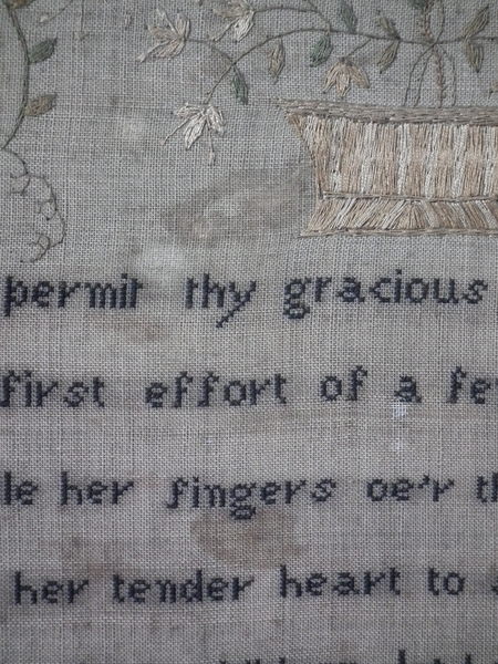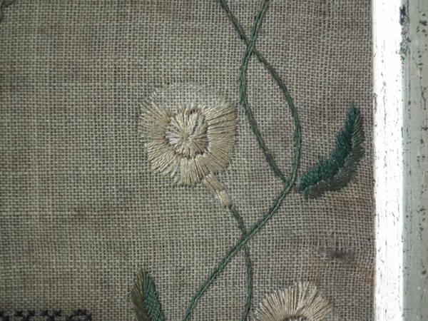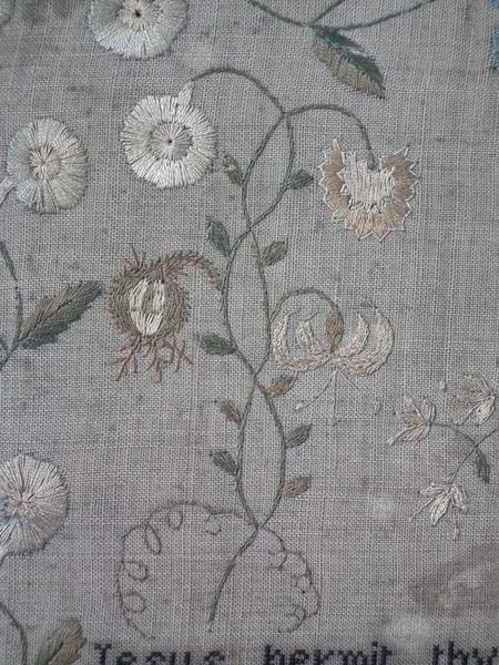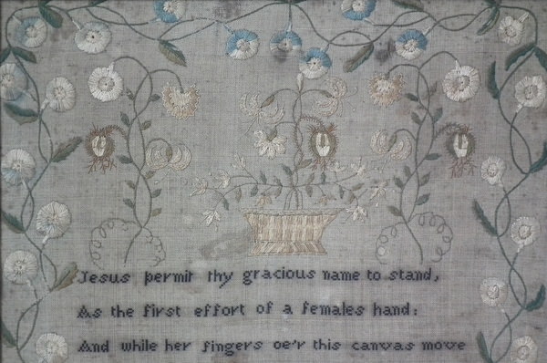 The sampler is worked in silk and cotton on linen ground, in a variety of stitches.