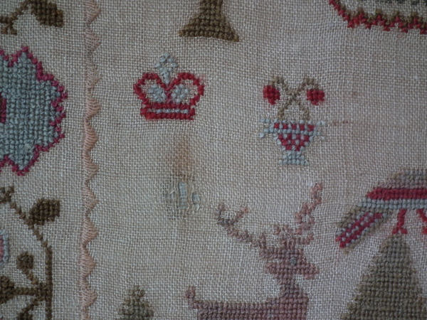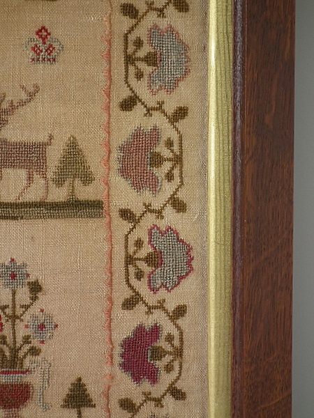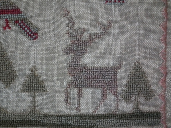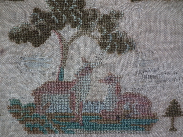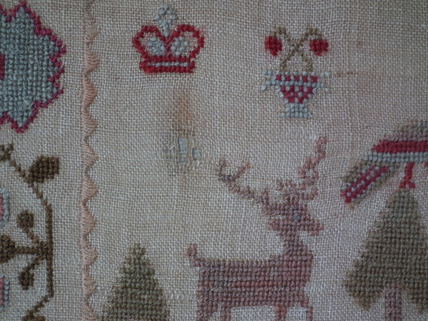 1835 Stag Sampler by Sarah Berry. Framed in an old wood frame with gilt slip and glass.