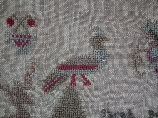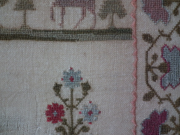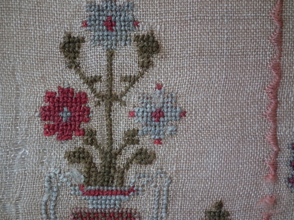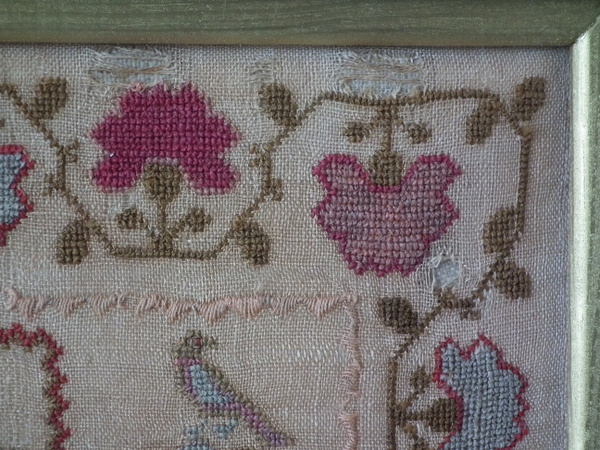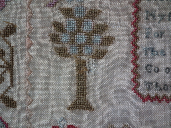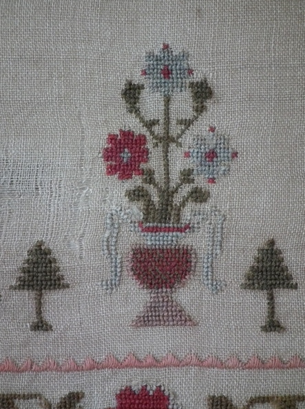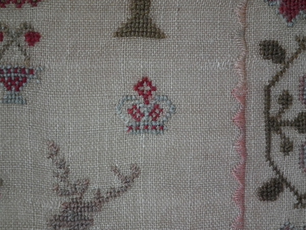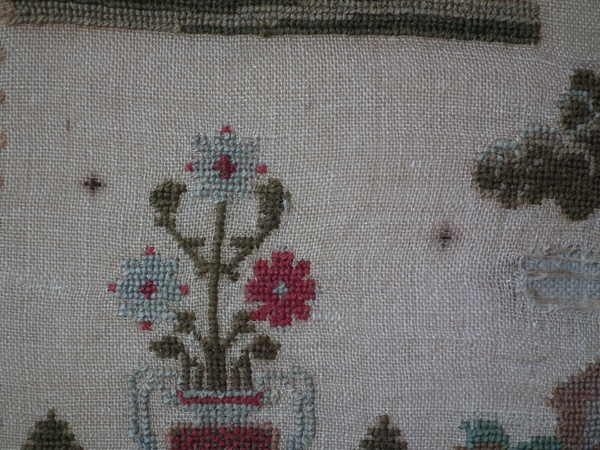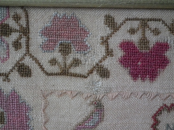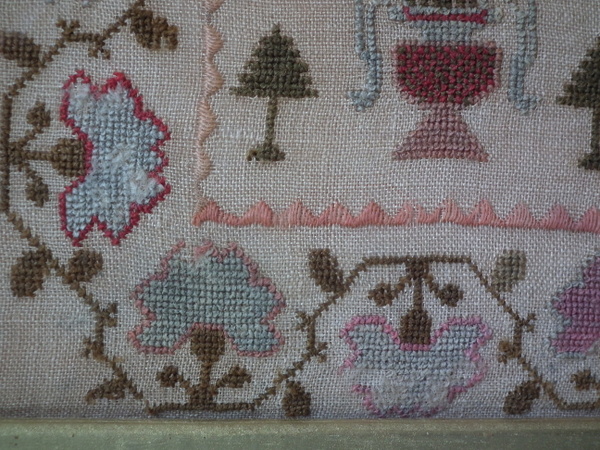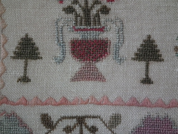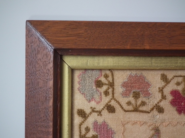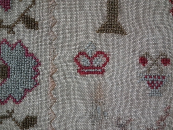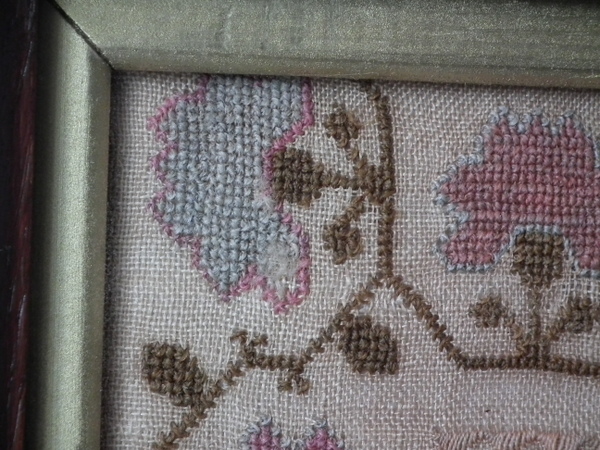 The sampler is worked in wool on canvas ground, in cross stitch throughout.