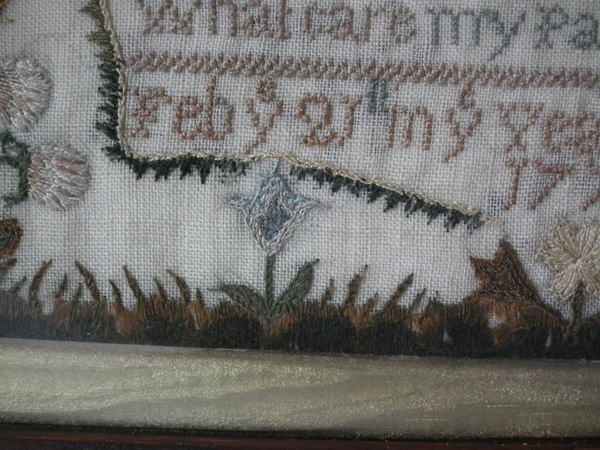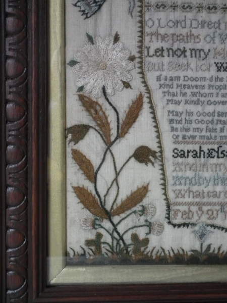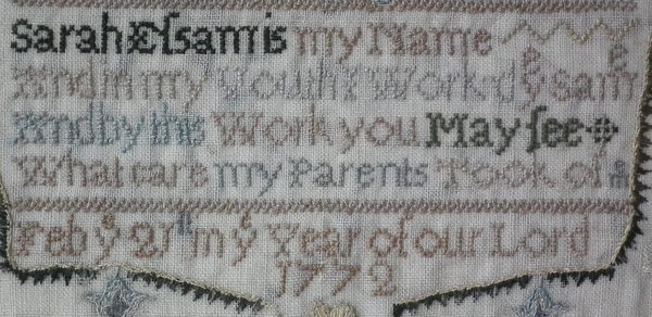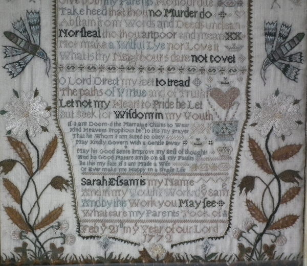 'Sarah Elsam is my name And in my Youth I work'd ye same And by this work you May fee what care my Parents Took of me Feb 21ft my Year of our Lord 1772'.