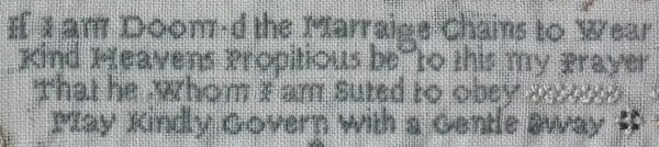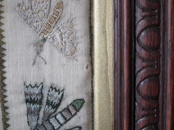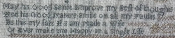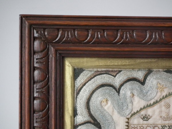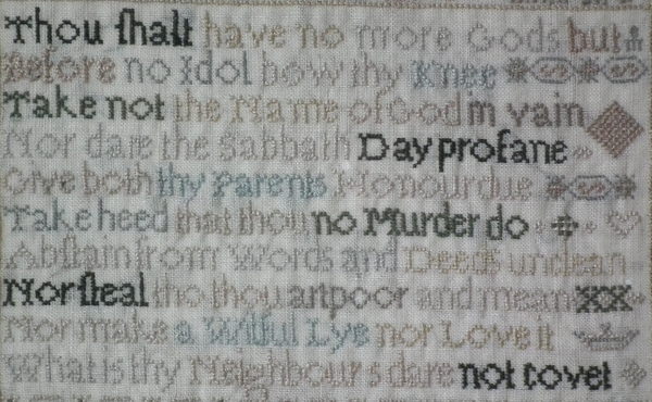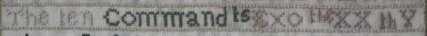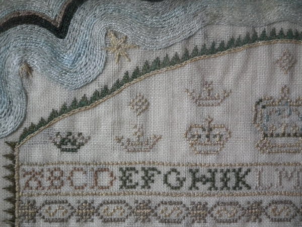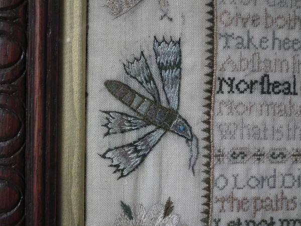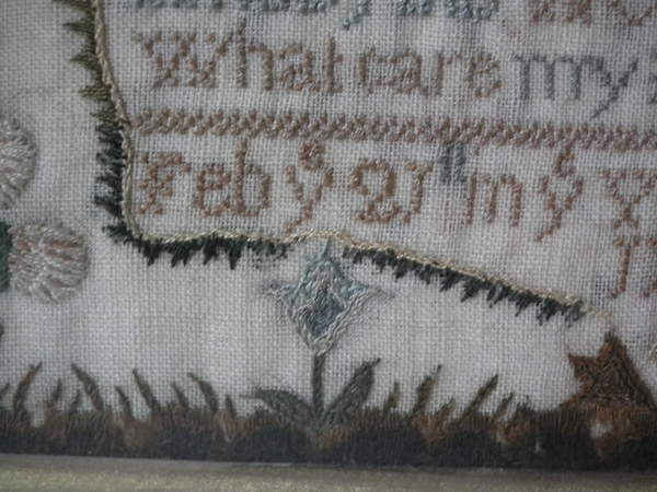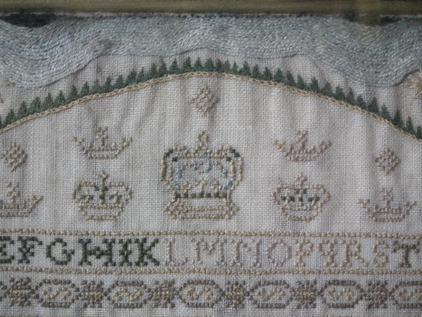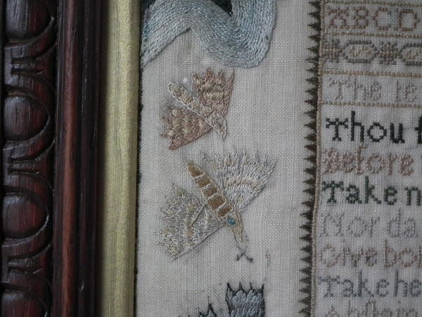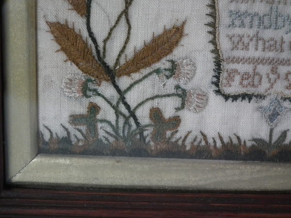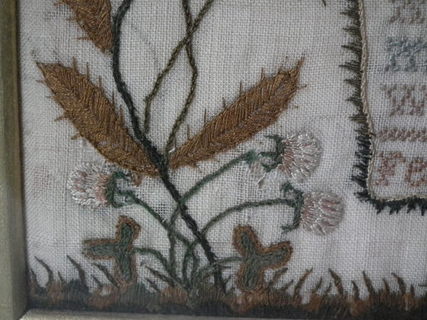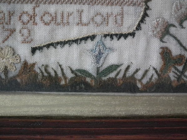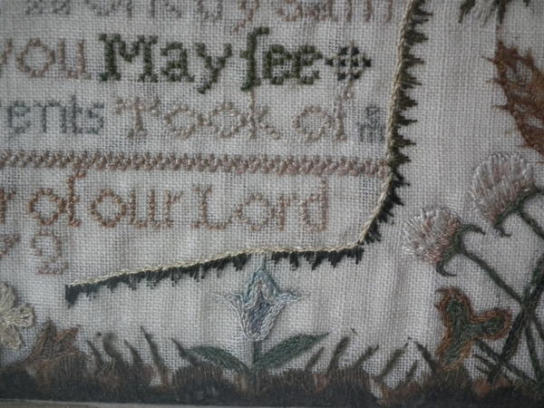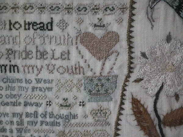 The sampler is worked in silk and cotton on linen ground, in a variety of stitches.