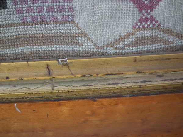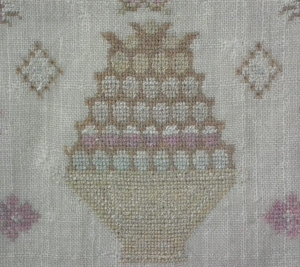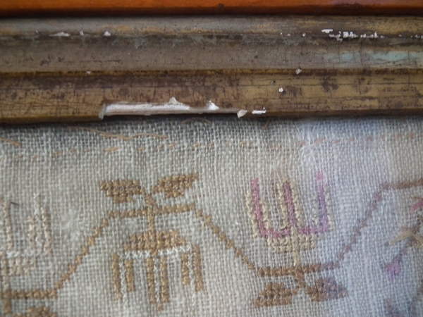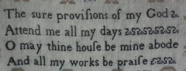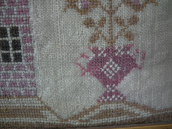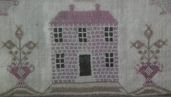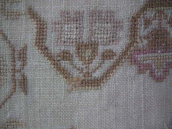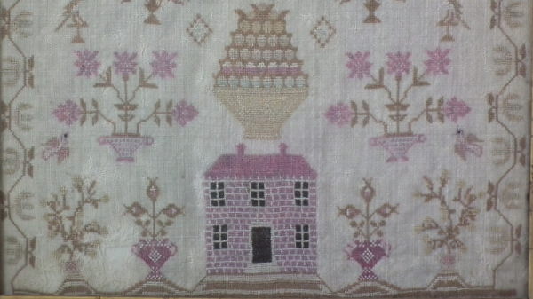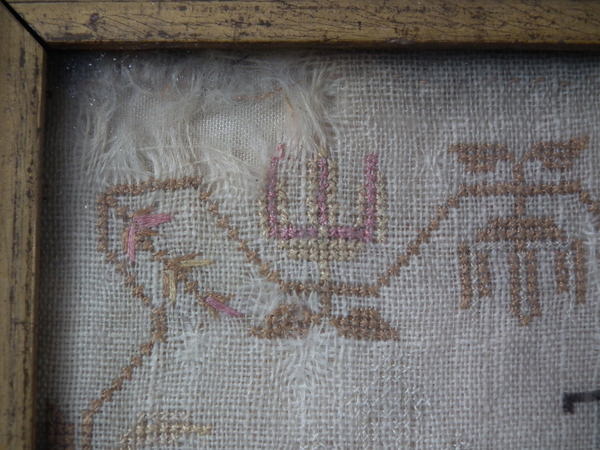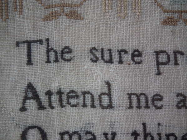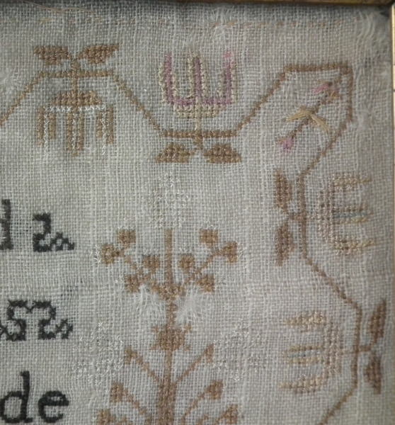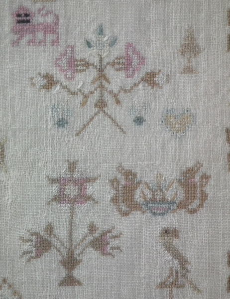 The sampler is worked in silk on linen ground, in a variety of stitches including Algerian eye.