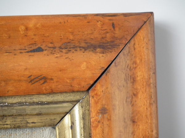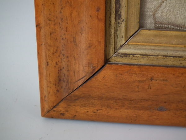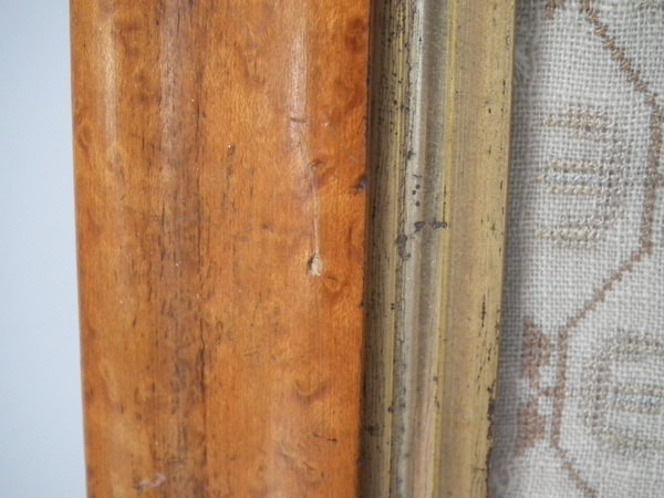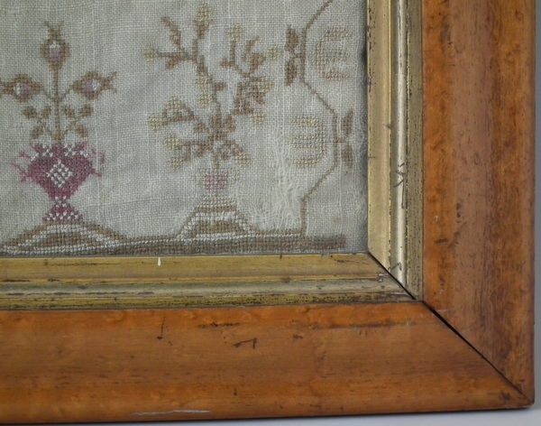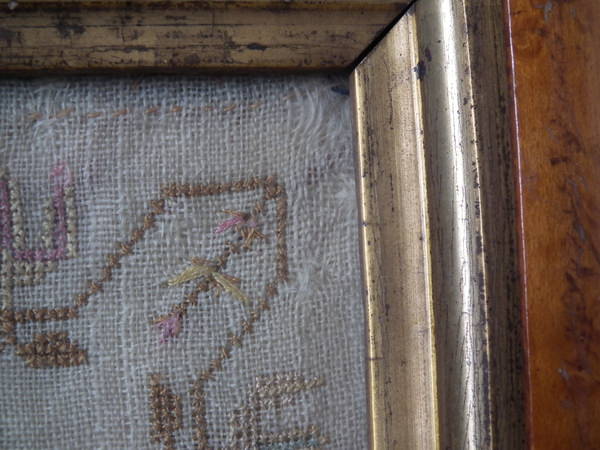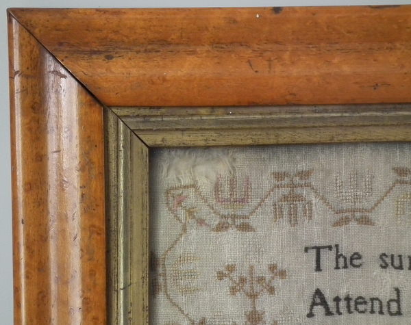 George III, dated 1810. 16ins by 11.75ins wide. 1810 Sampler by Maria Elliss. Framed in an old, burr maple frame with gilt slip and rippled, old glass.