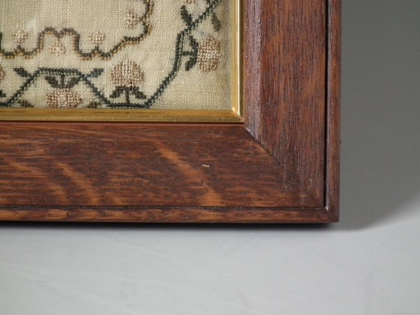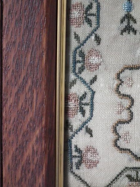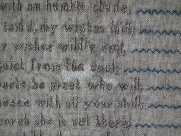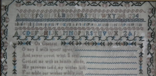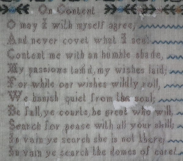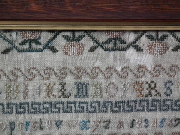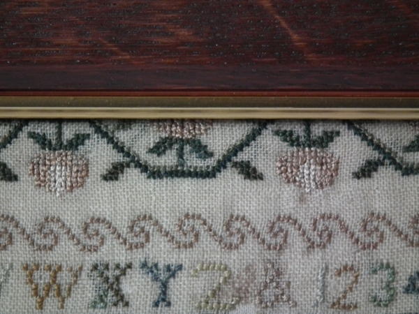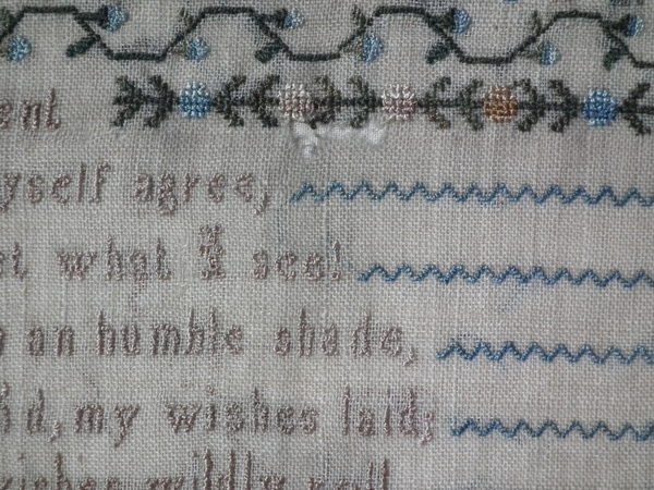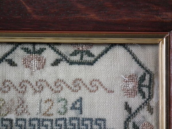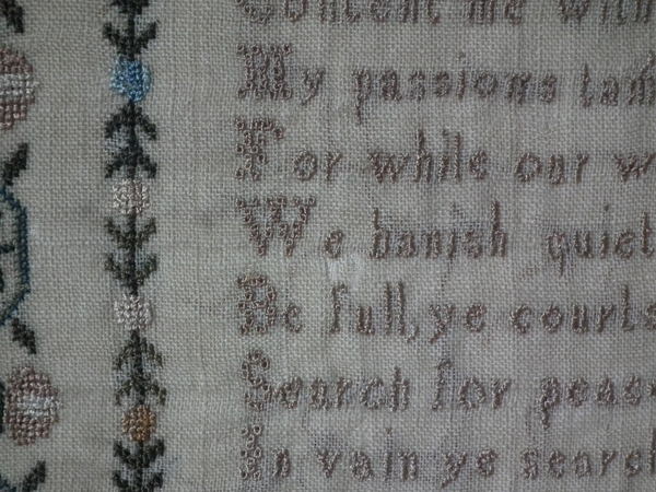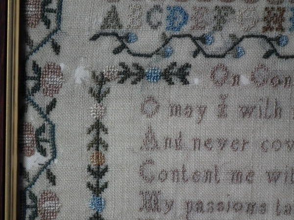 The sampler is worked in silk on linen ground, in a variety of stitches.