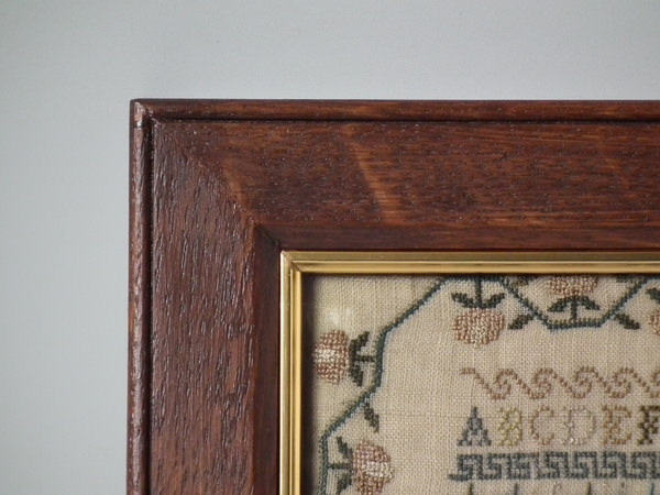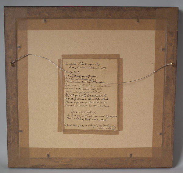 1818 Verse Sampler by Mary Simpson Whitehead. Framed in an old wood frame with gilt slip and glass.