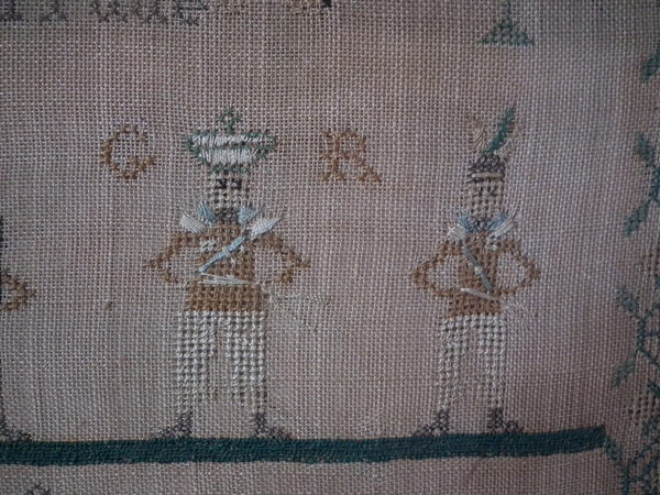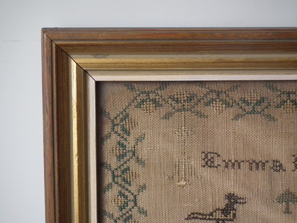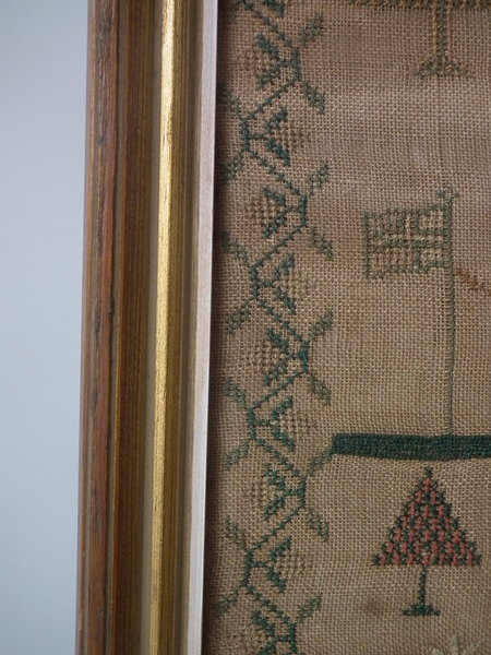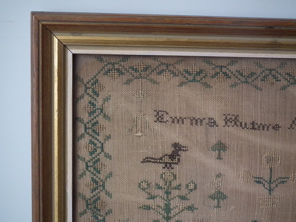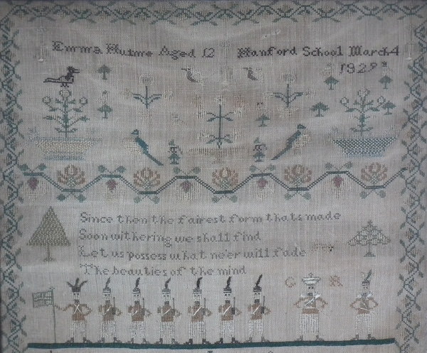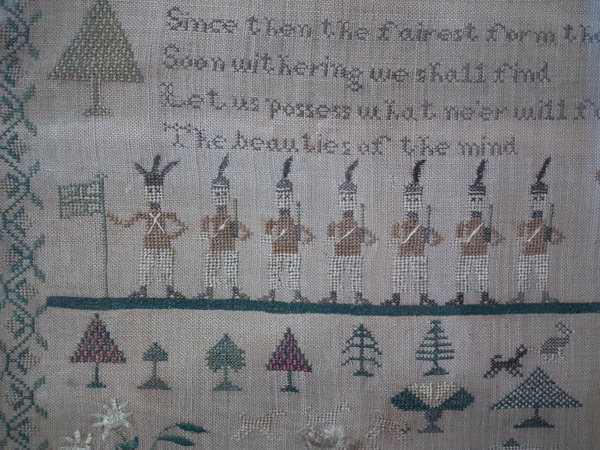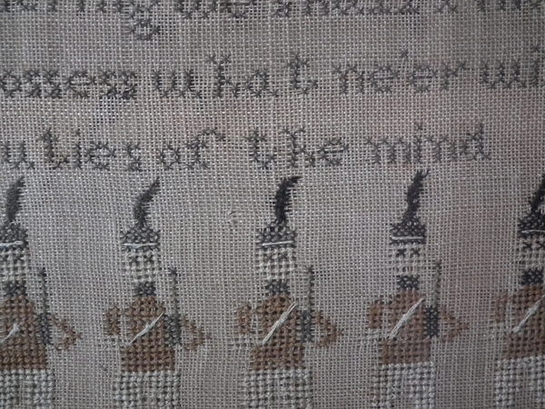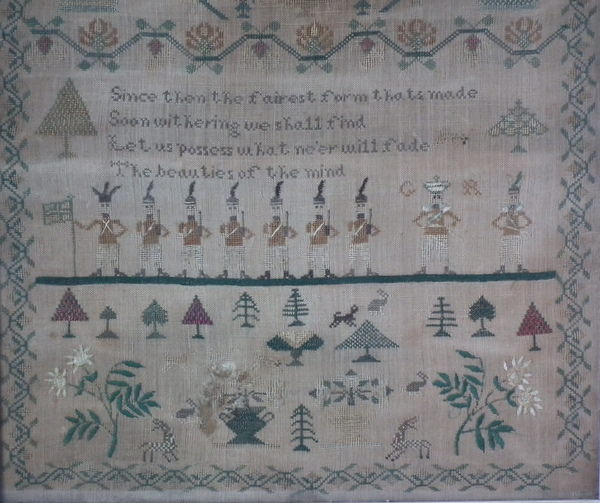 George IV, dated 1829. 20.25ins by 17.5ins wide. 1829 Soldier Sampler by Emma Hulme. Framed in a modern, gilt over wood, frame with glass.