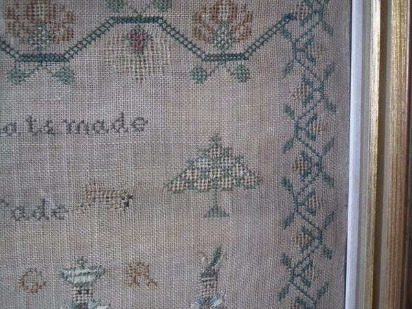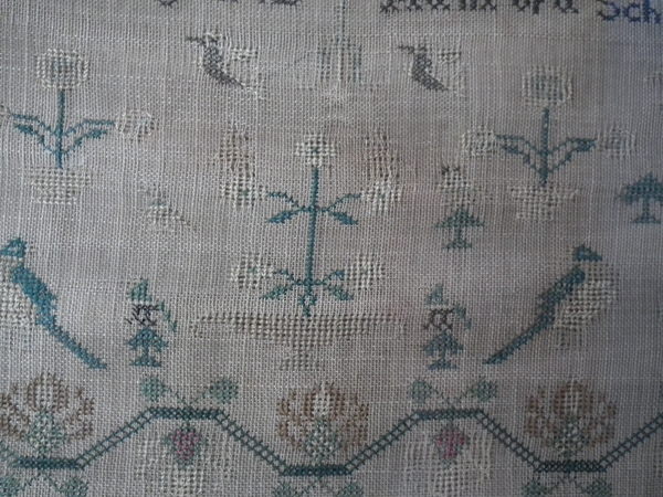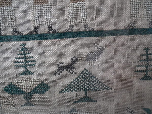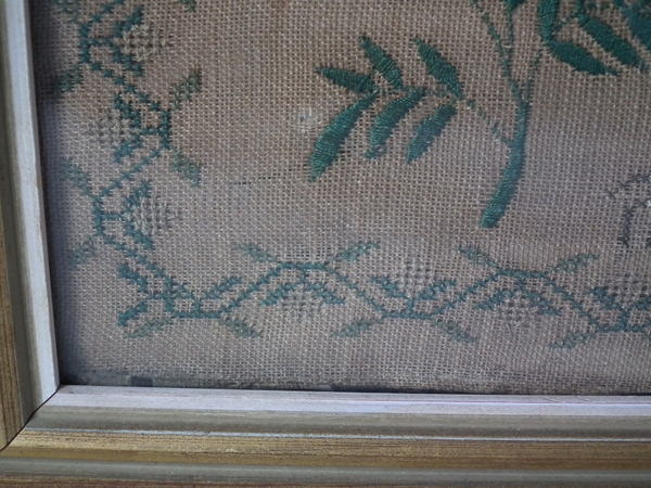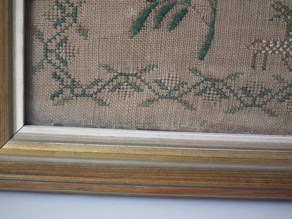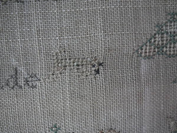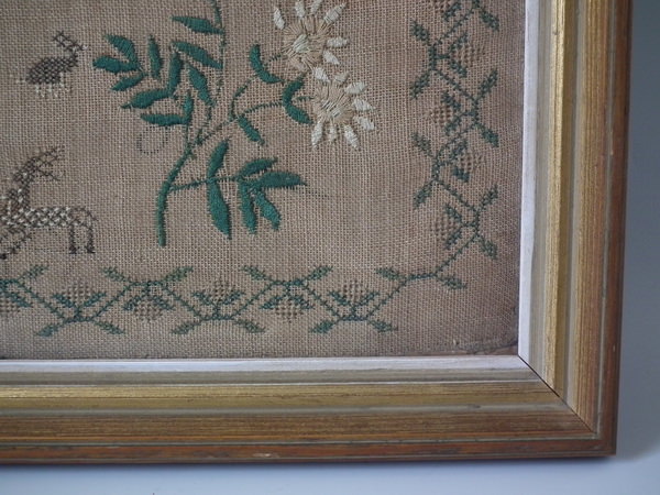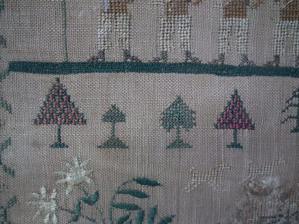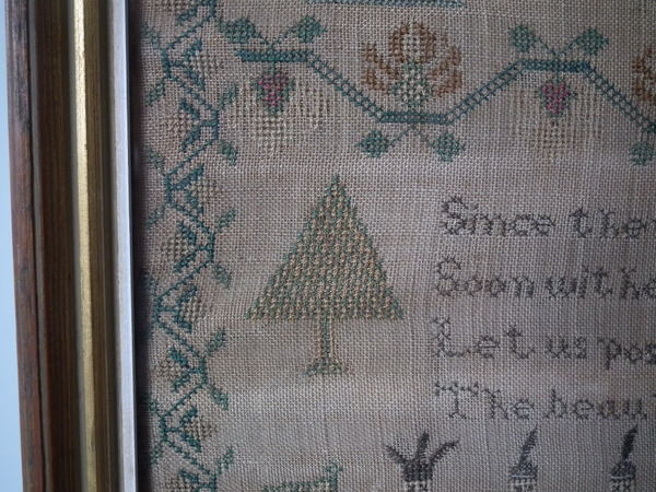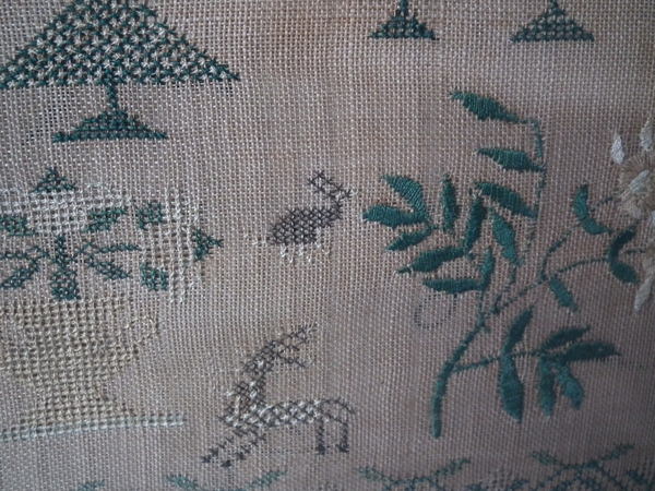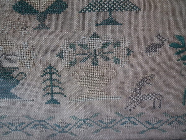 The sampler is worked in a silk-like thread on canvas ground, in a variety of stitches.