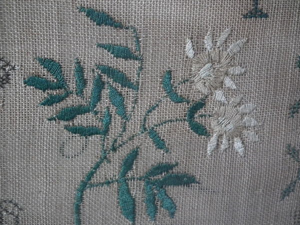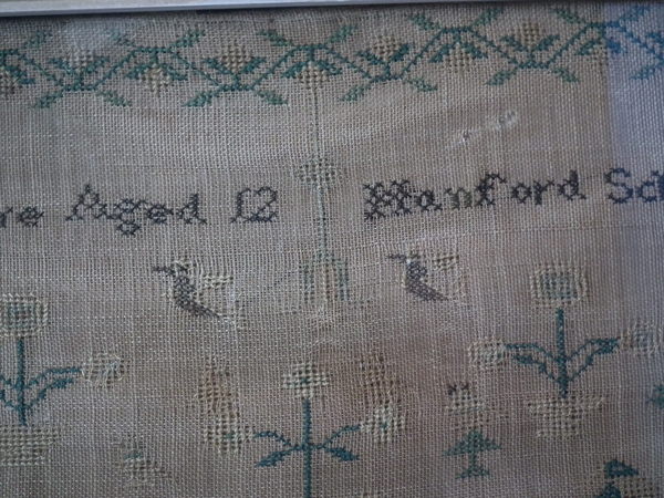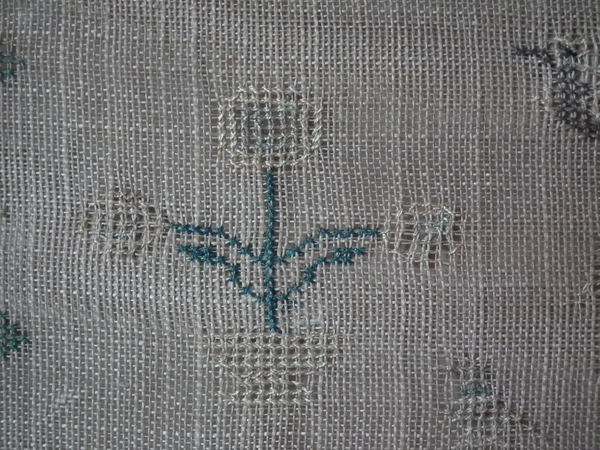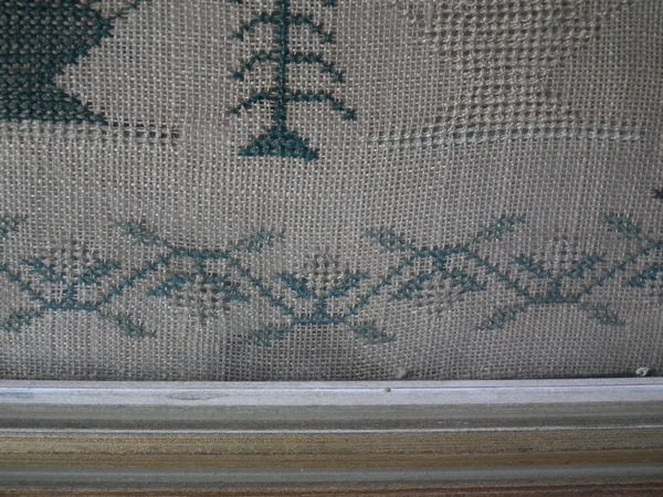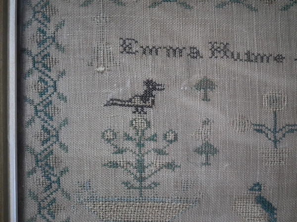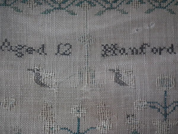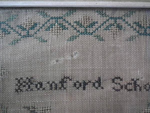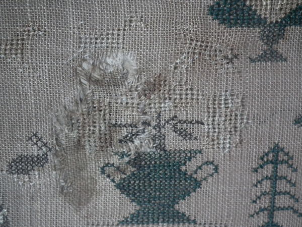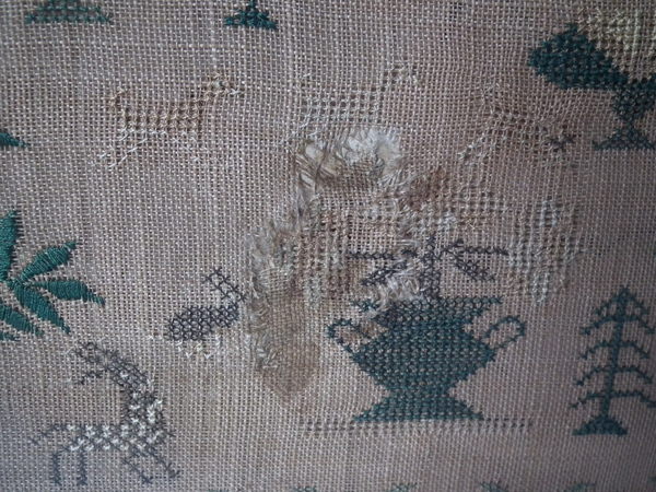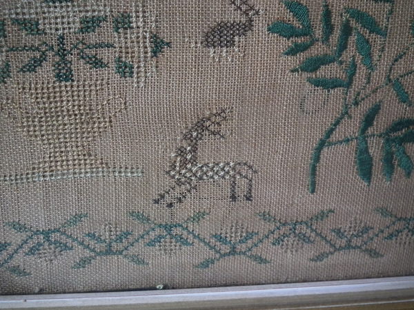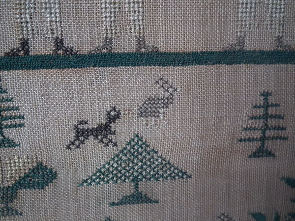 The sampler is worked in a silk-like thread on canvas ground, in a variety of stitches.