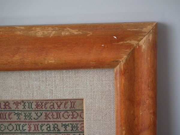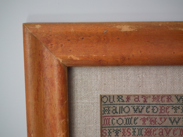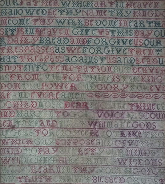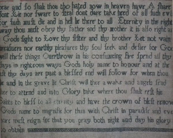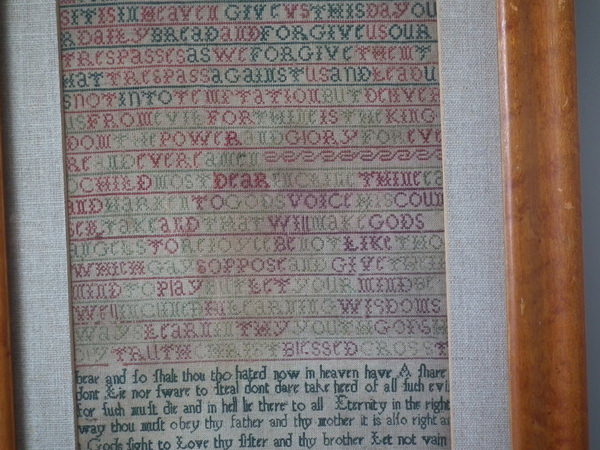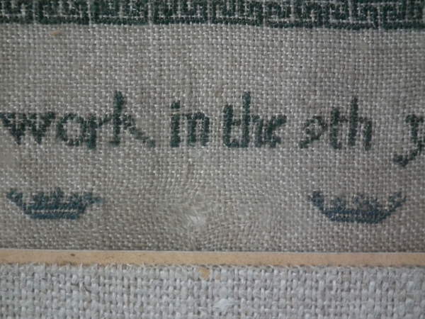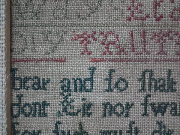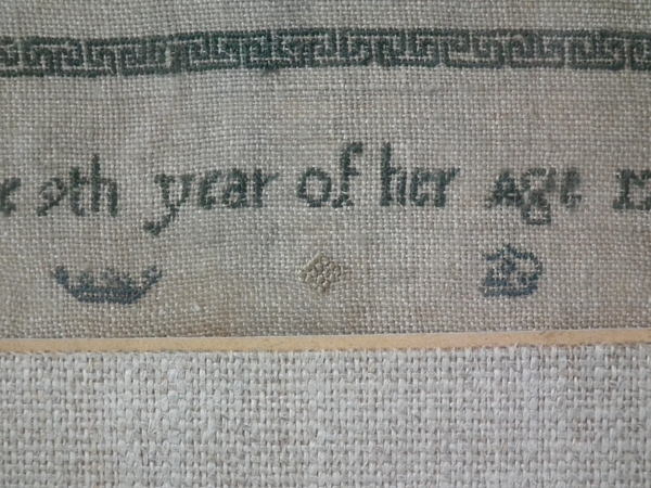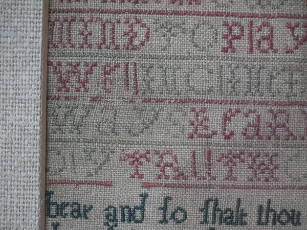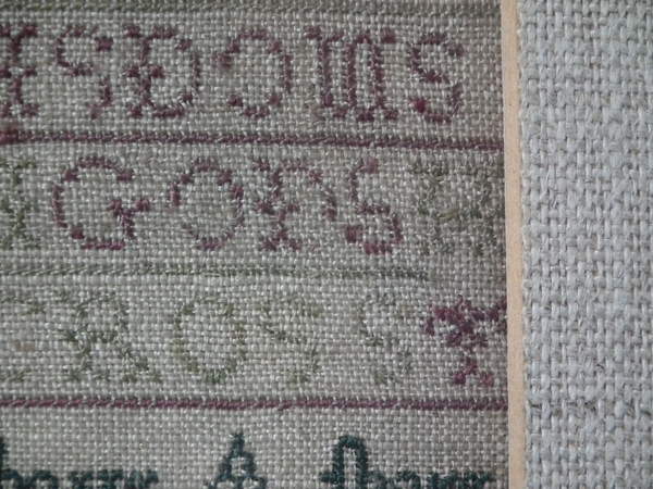 The sampler is worked in silk on linen ground, in cross stitch throughout.