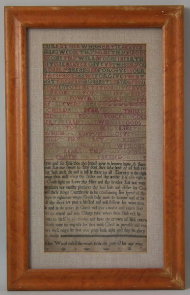 George II, dated 1736. 15.5ins by 7.75ins wide. 1736 Sampler by Alice Wood. Framed in a modern wood frame with glass.