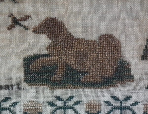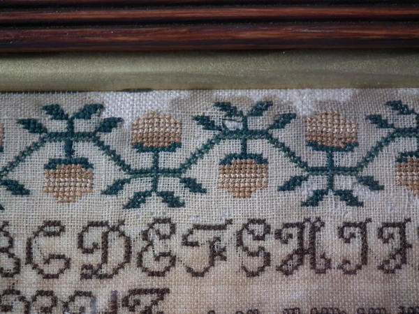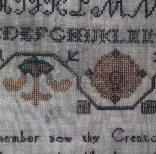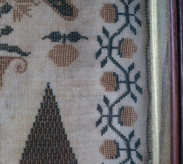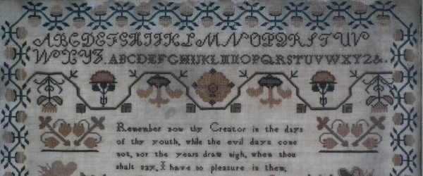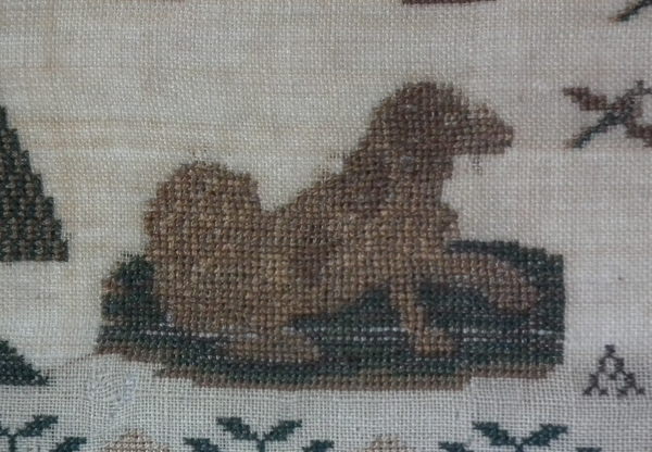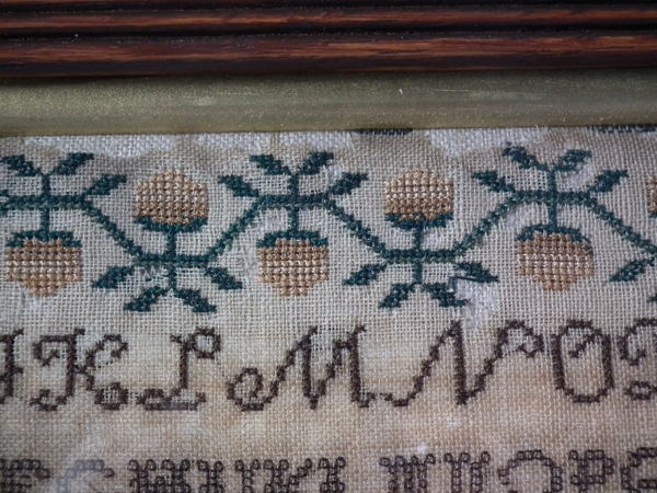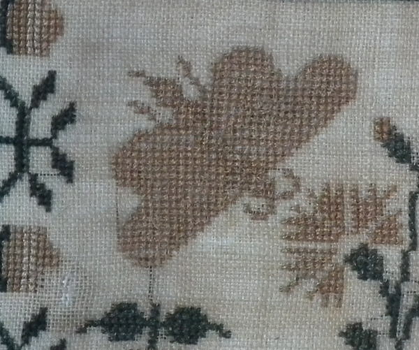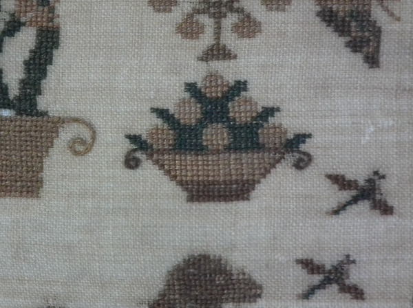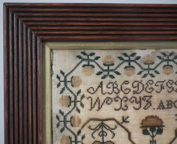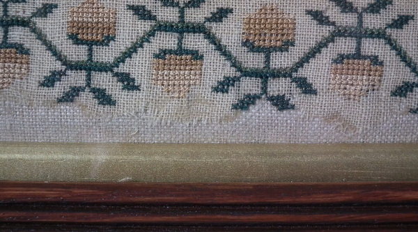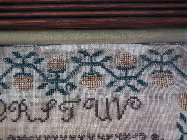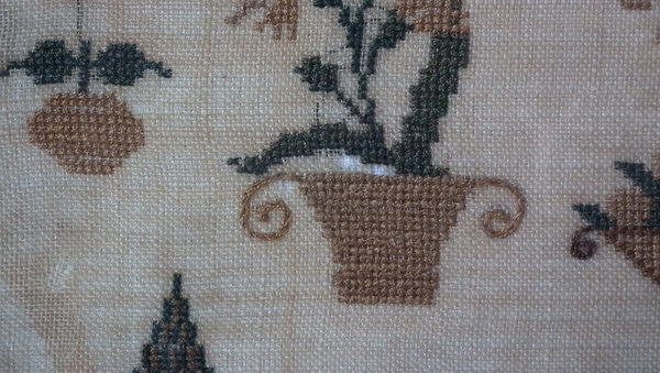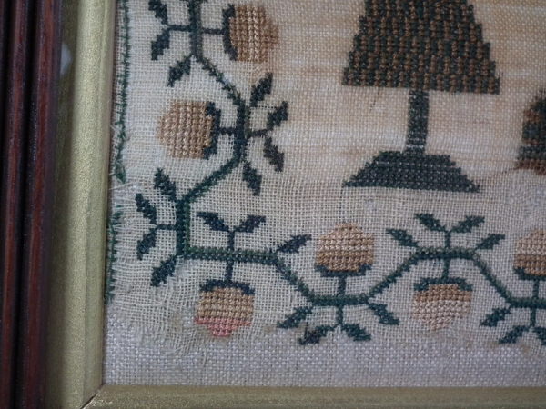 CONDITION: Generally good. A few small holes and some loss of ground to the top and bottom edges. The sampler has been glued to the backing with conservators glue, to the very top and bottom edges only.