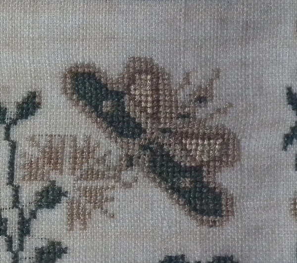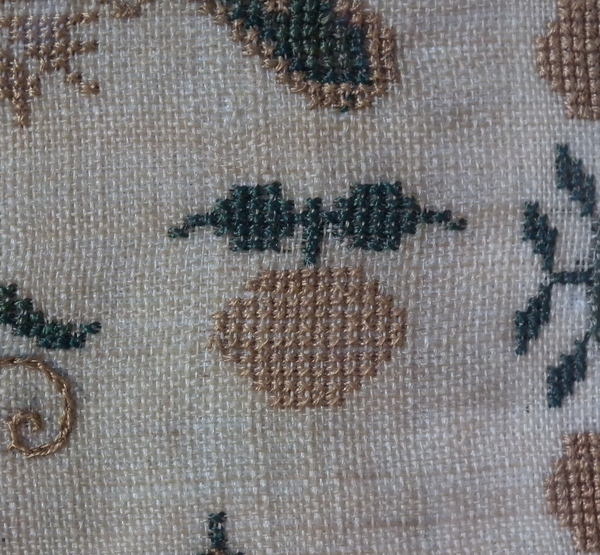 The sampler is worked in silk on linen ground, in a variety of stitches.