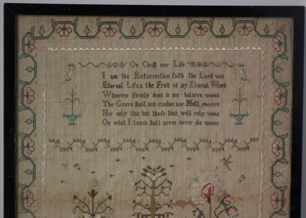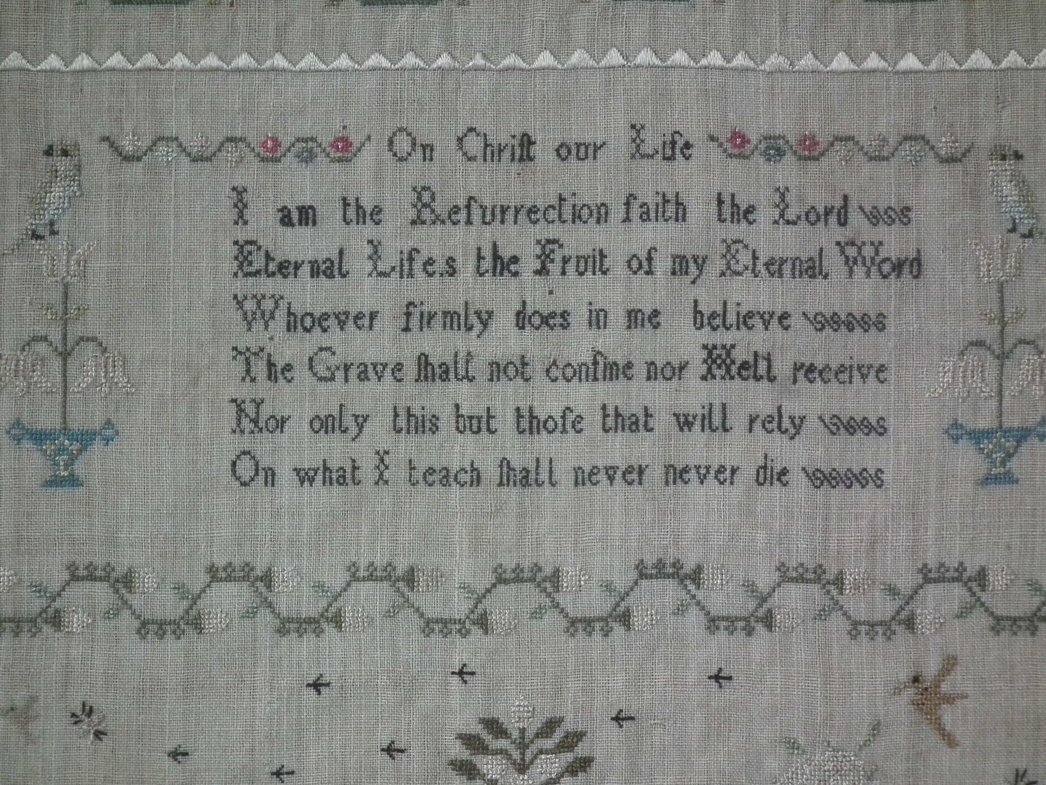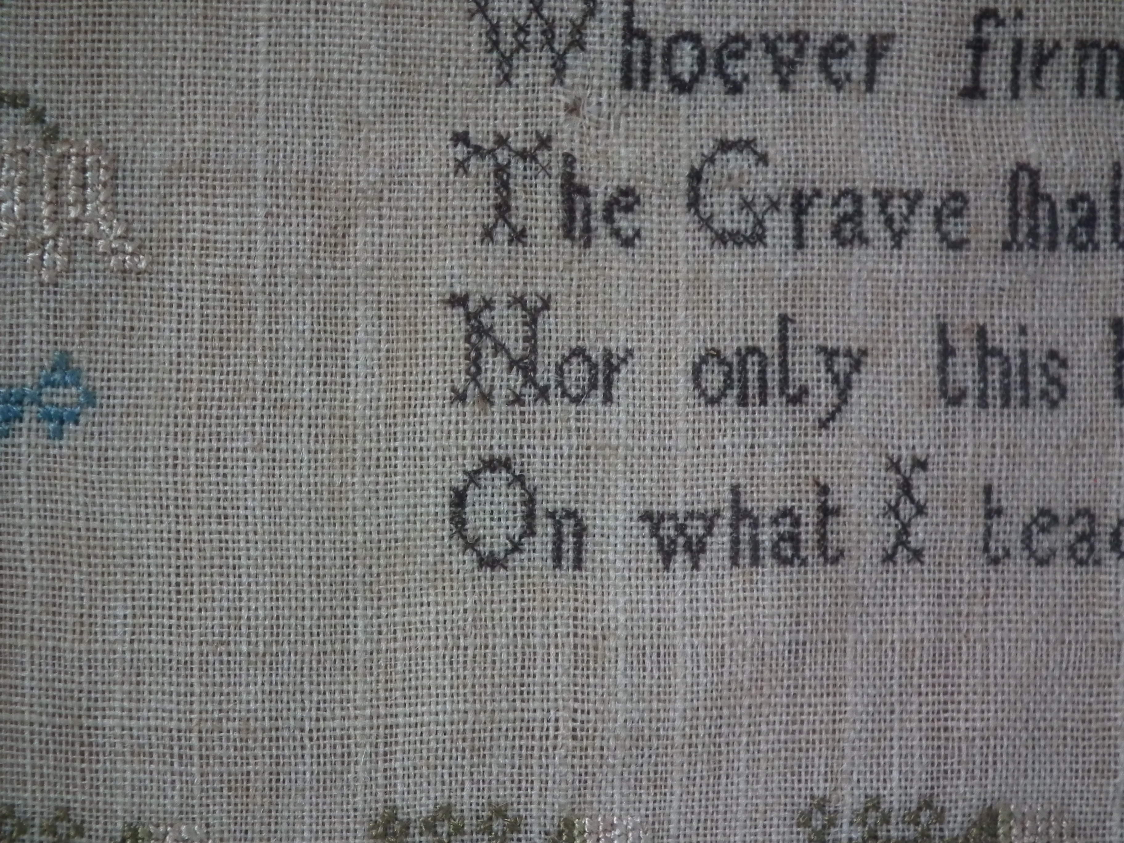 The sampler is worked in fine silk on linen ground, in a variety of stitches.