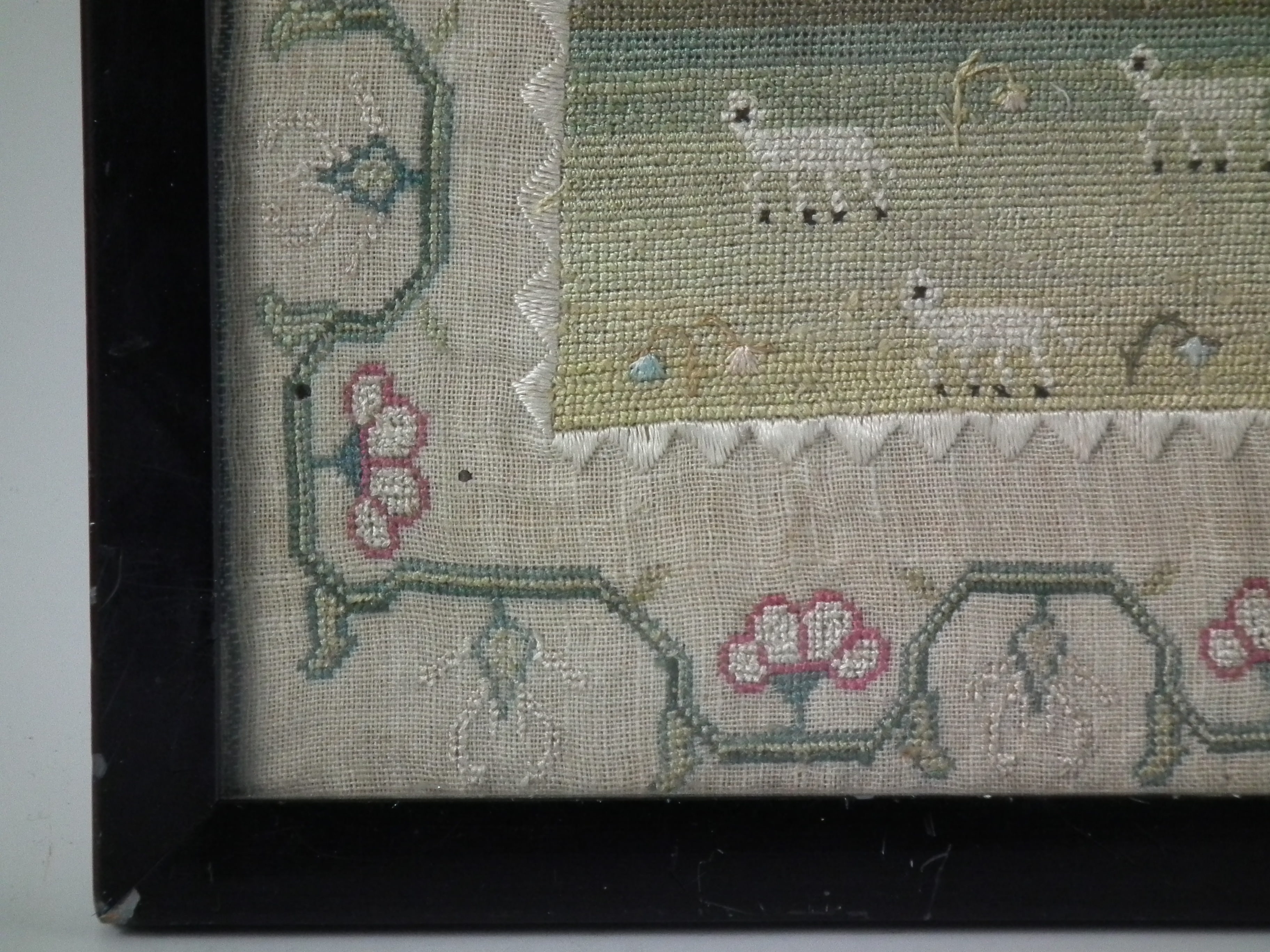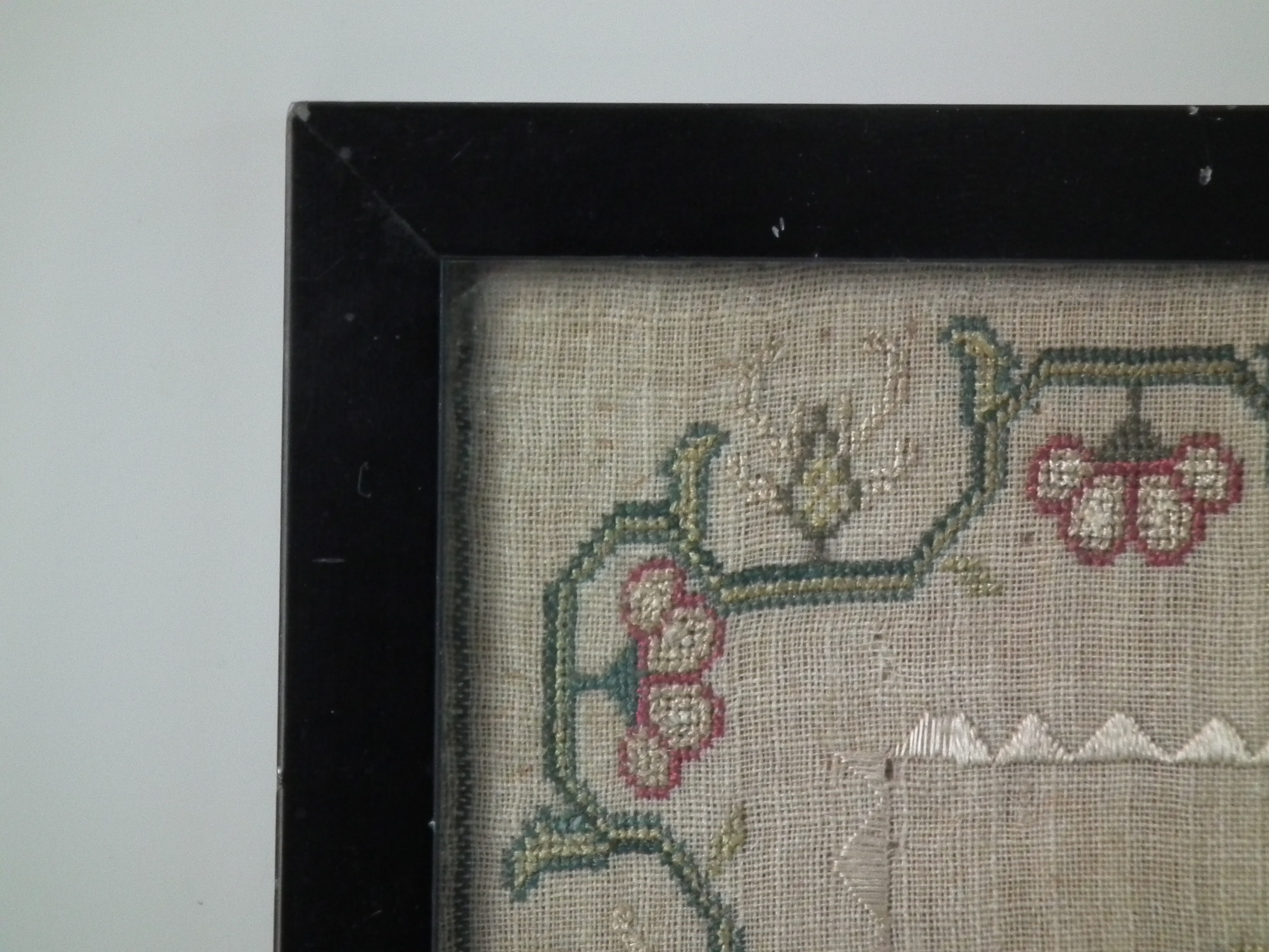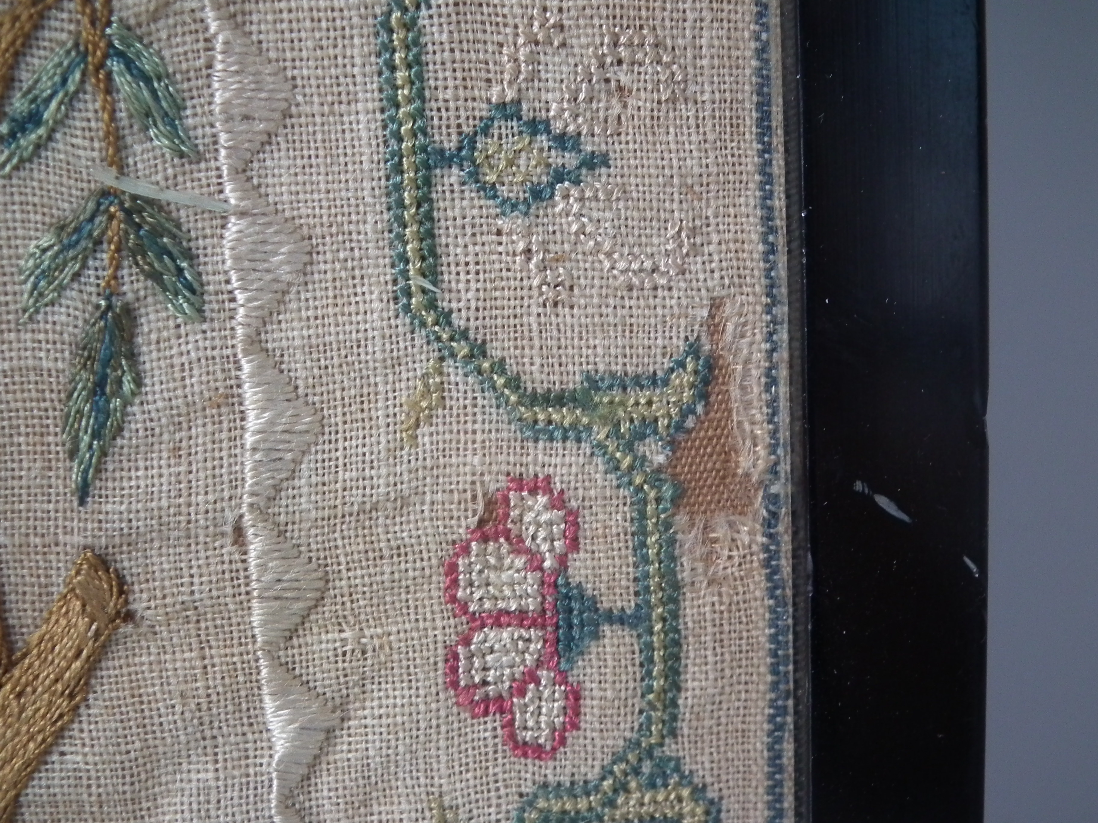 The sampler is worked in fine silk on linen ground, in a variety of stitches.