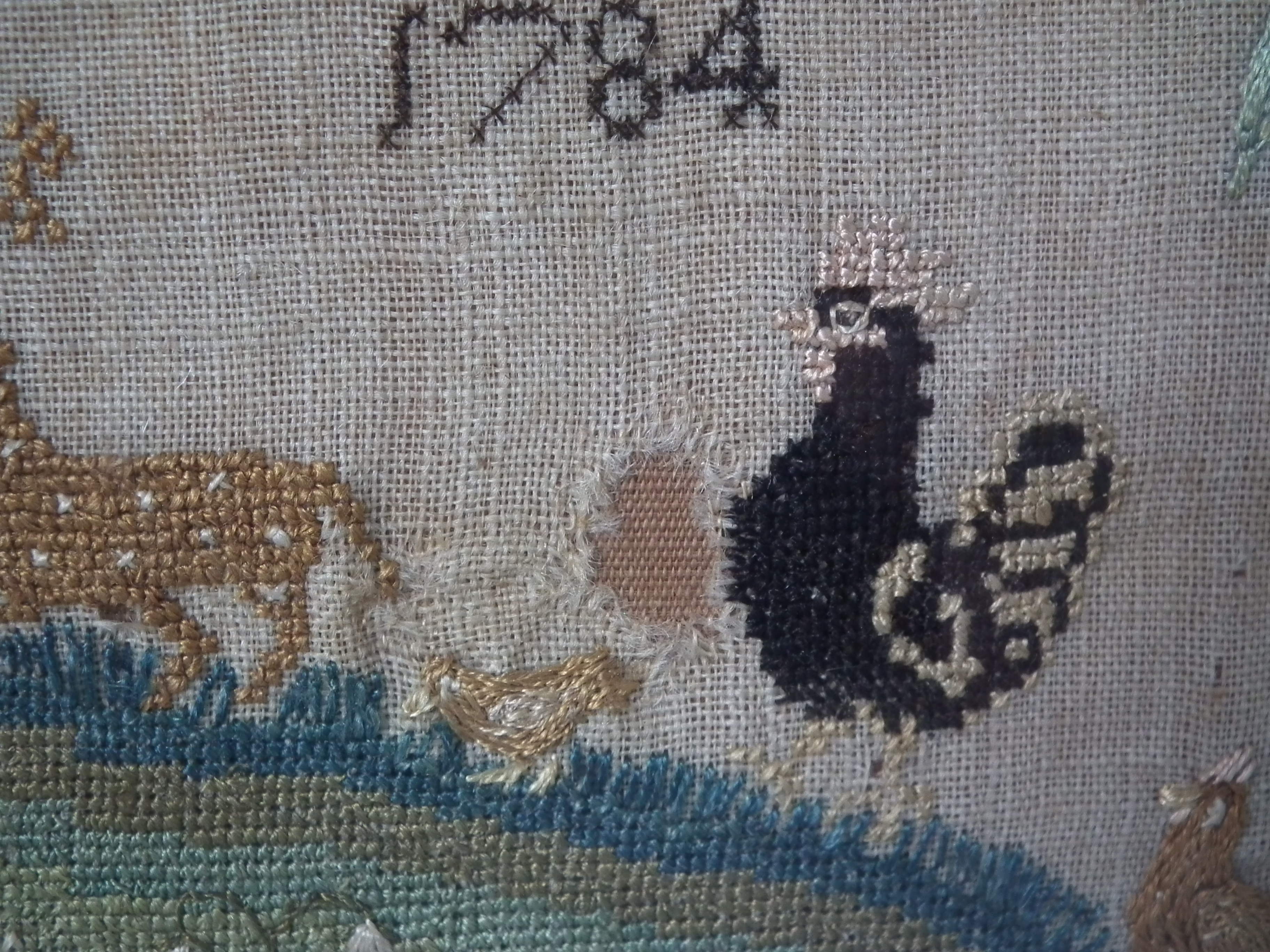 George III, dated 1784. 17ins by 12ins wide. 1784 Country Scene Sampler by Sarah Tyce. Framed in an old wood frame with rippled, old glass.
