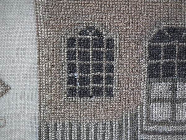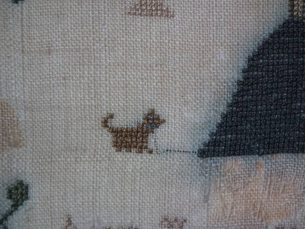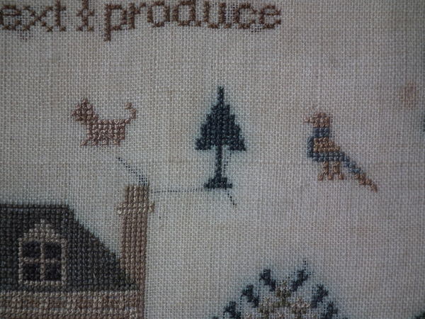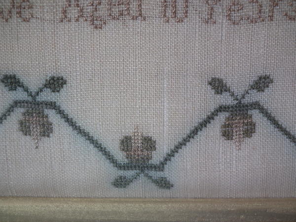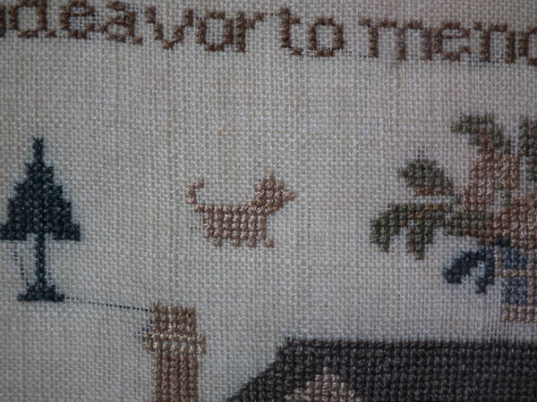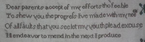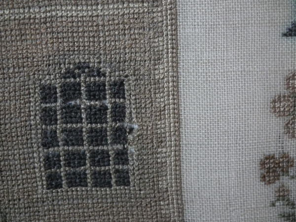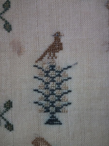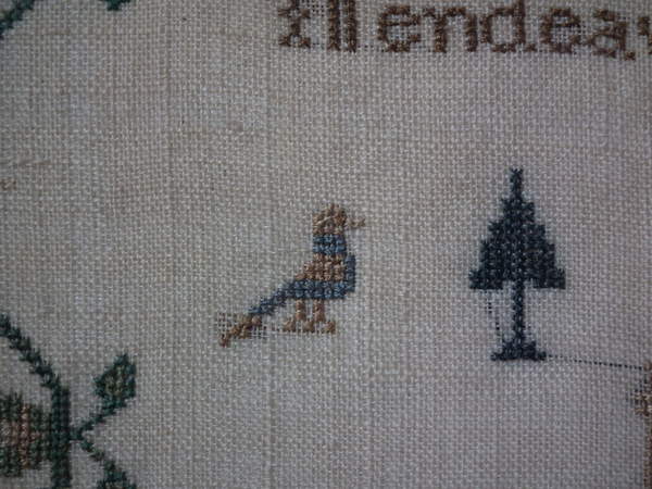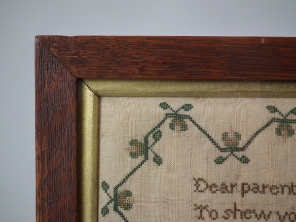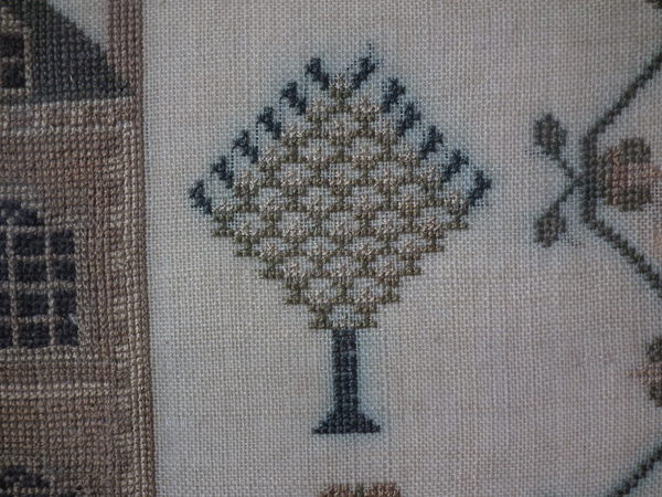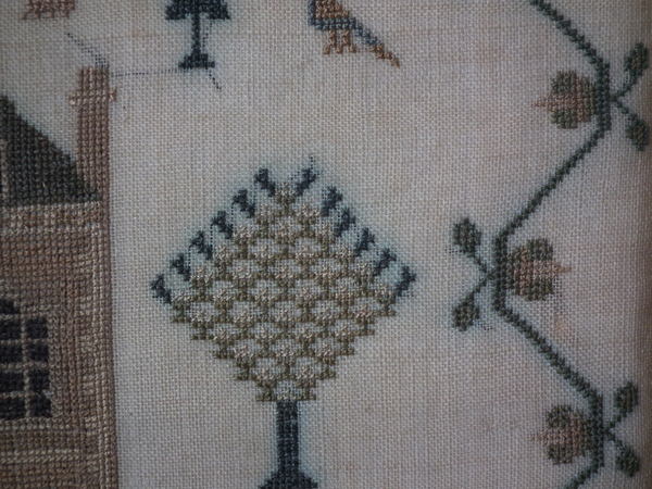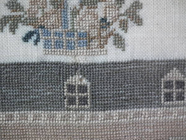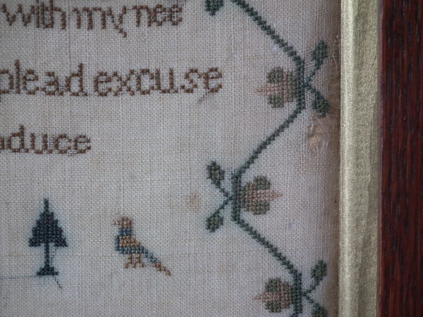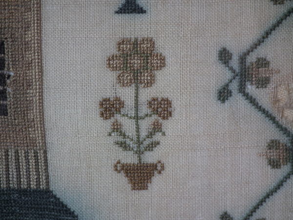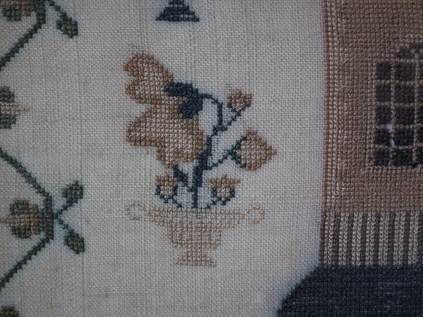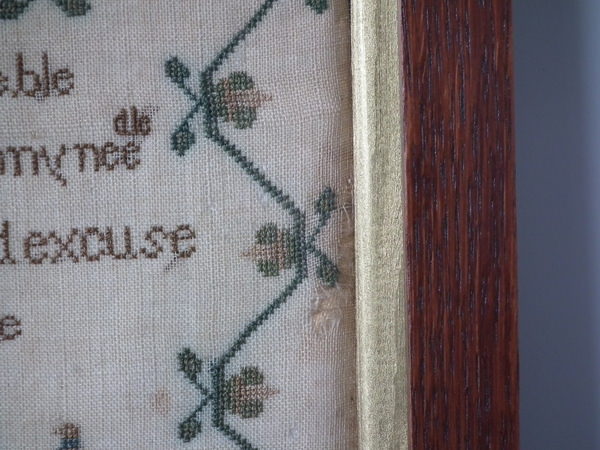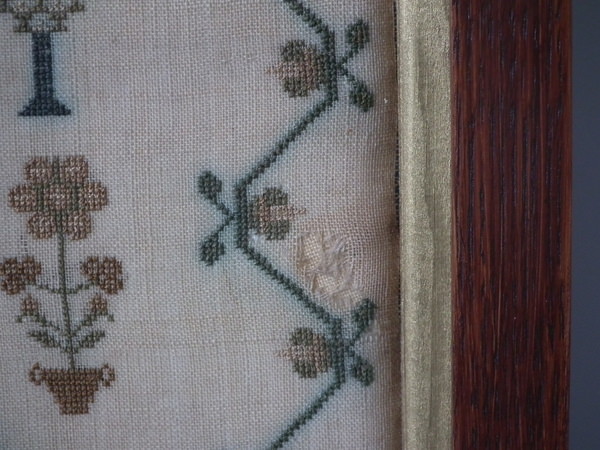 The sampler is worked in silk on linen ground, in cross stitch throughout.