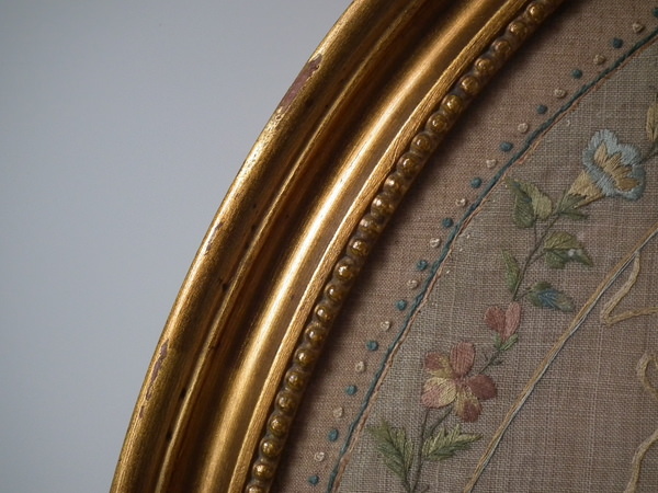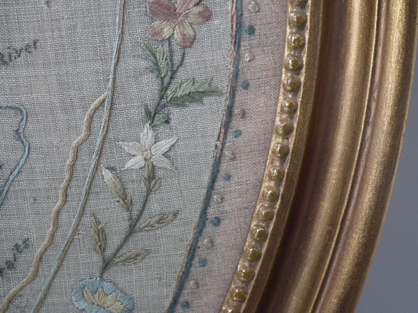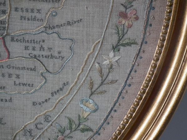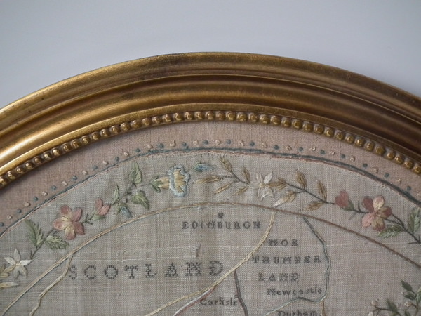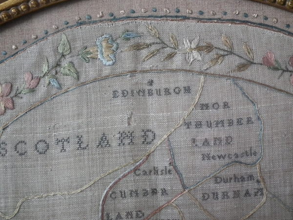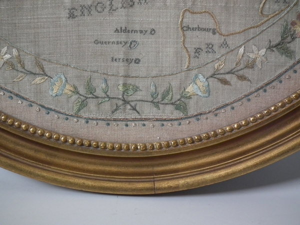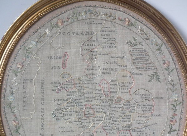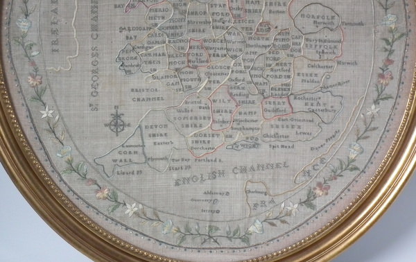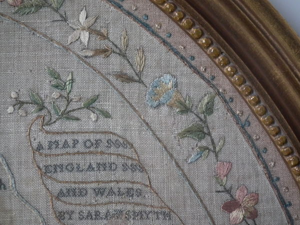 George III, dated 1794. 21.5ins by 19.5ins wide. 1794 England & Wales Map Sampler by Sarah Smyth. Framed in an old, gilt over wood, frame with glass.