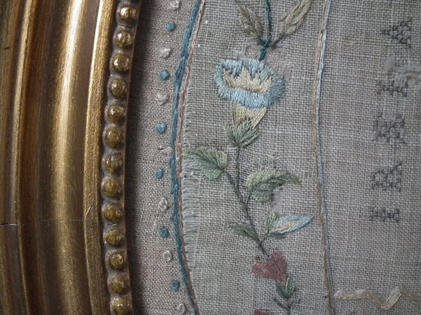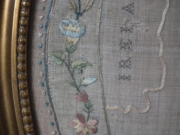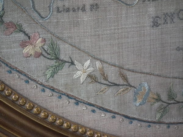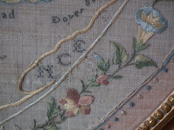 The sampler is worked in silk on linen ground, in a variety of stitches.