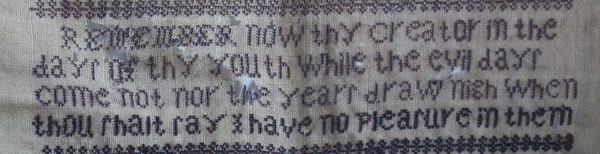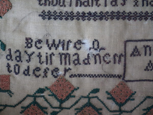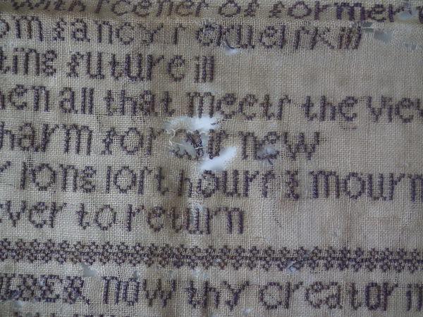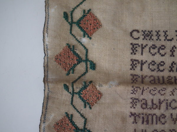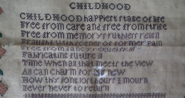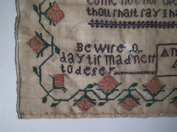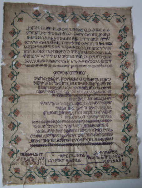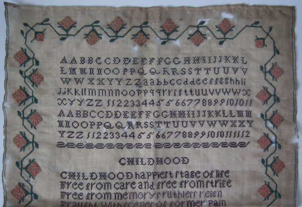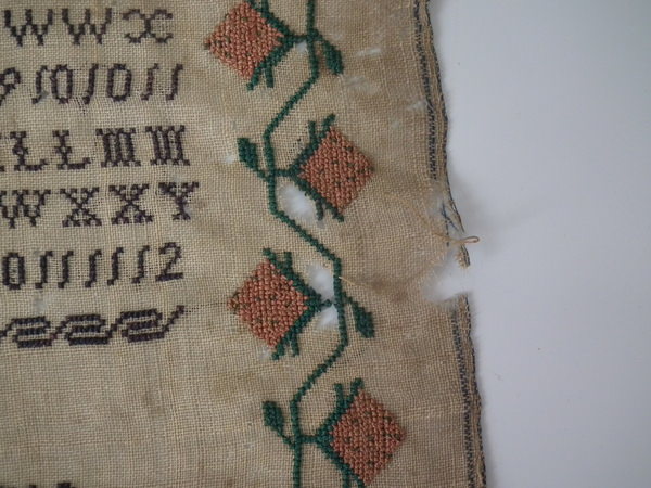 The sampler is worked in silk on linen ground, in cross stitch throughout.
