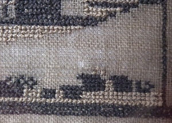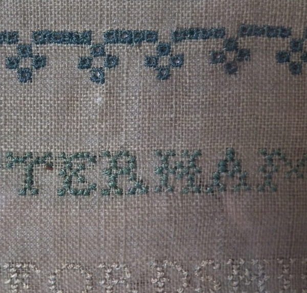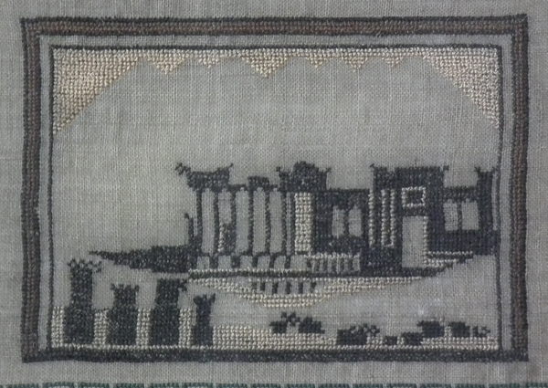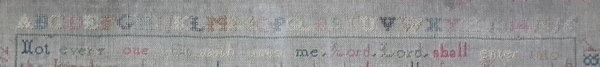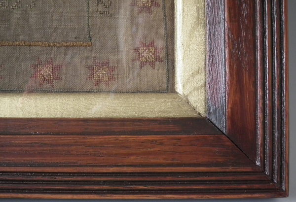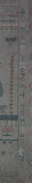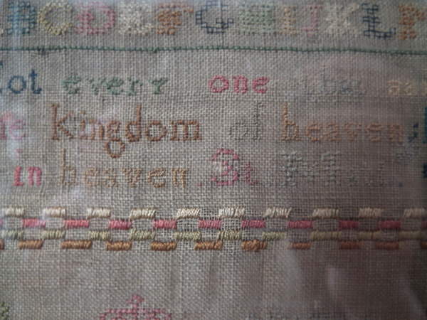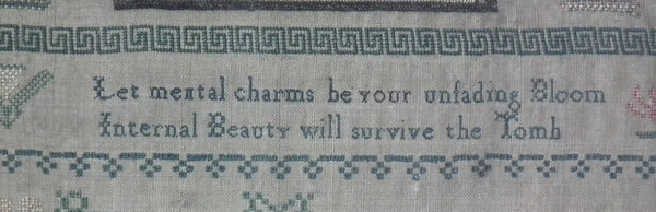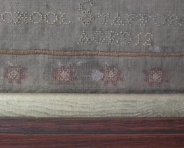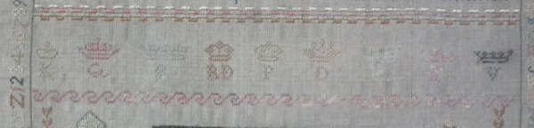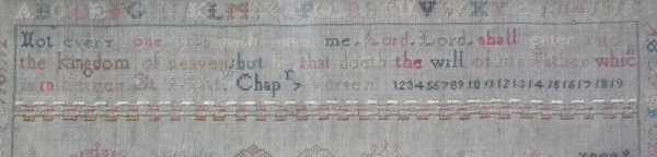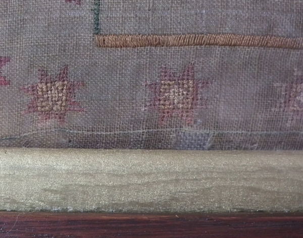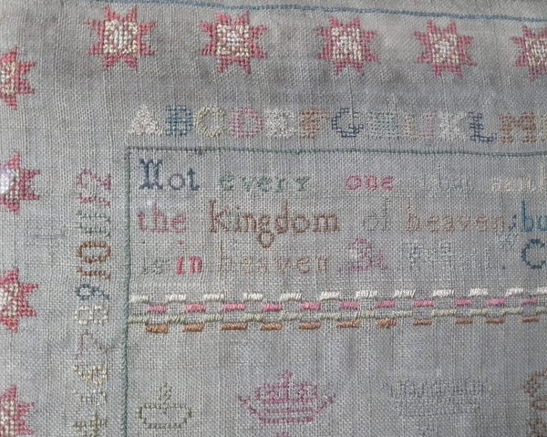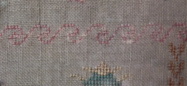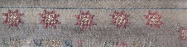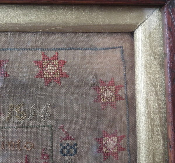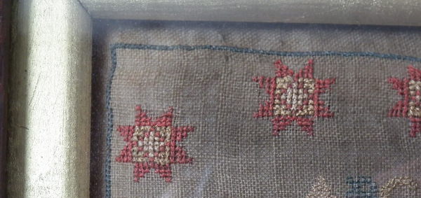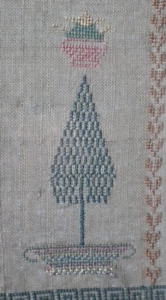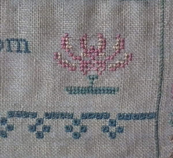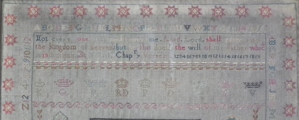 The sampler is worked in silk on linen ground, in cross stitch and Algerian eye.