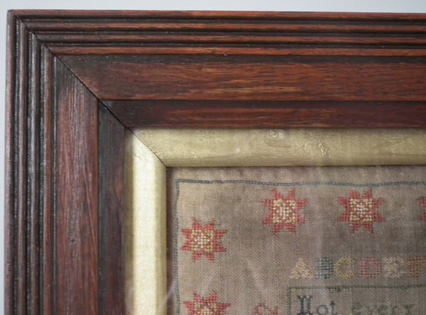George IV, dated 1823. 13.25ins by 12.5ins wide. 1823 School Sampler by Bennet Motterham. Framed in an old wood frame with gilt slip and glass.