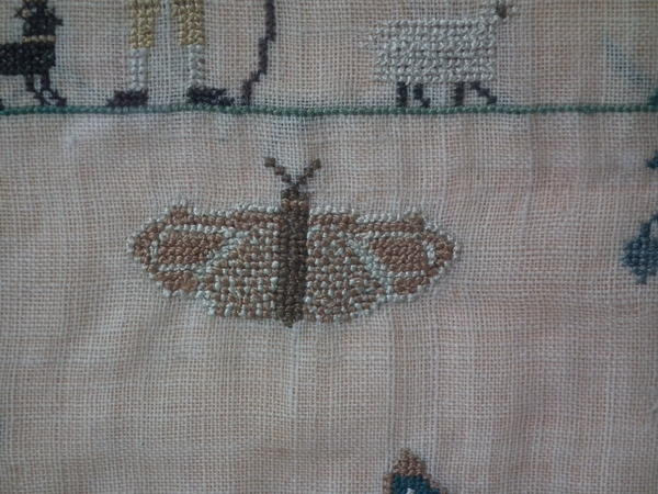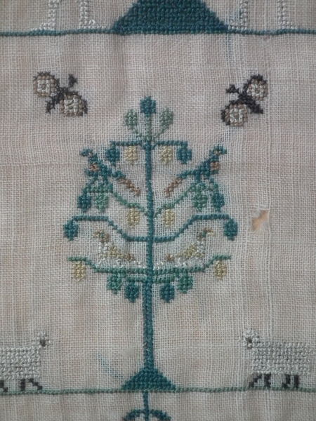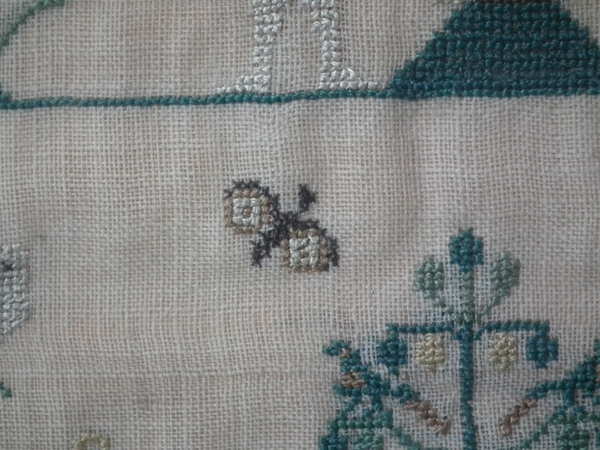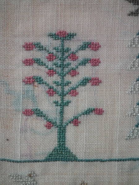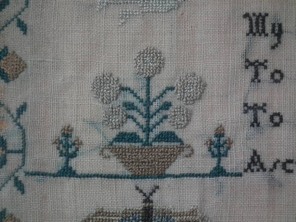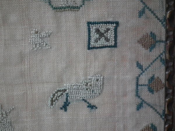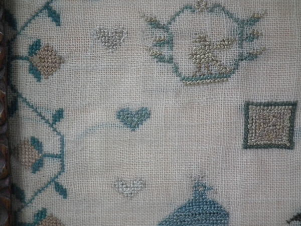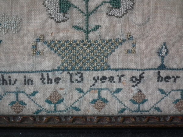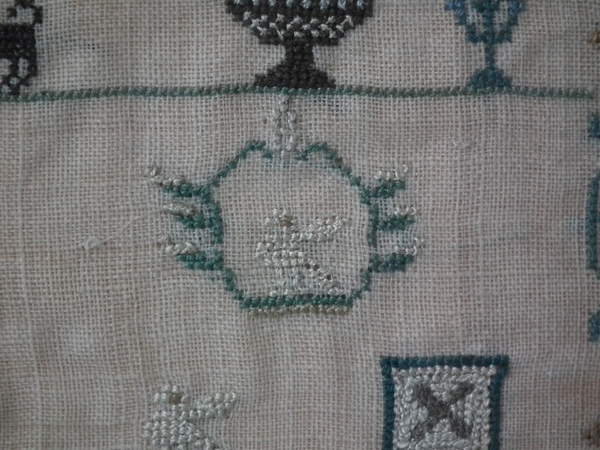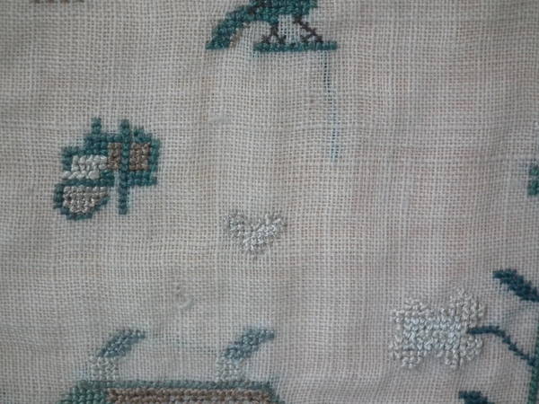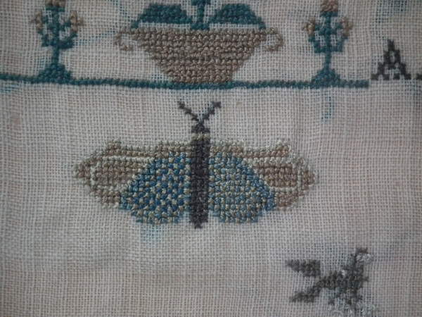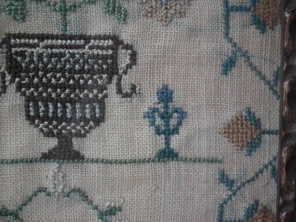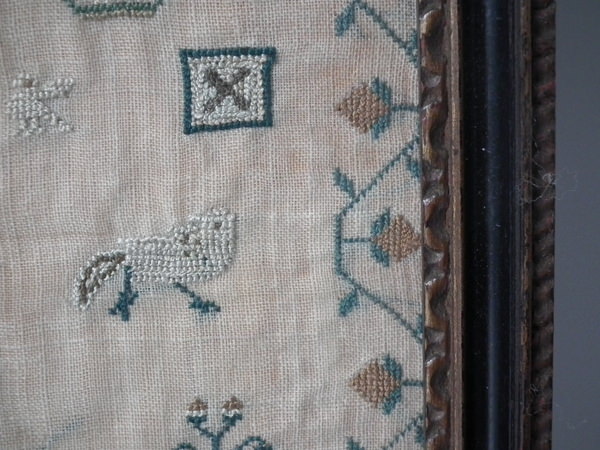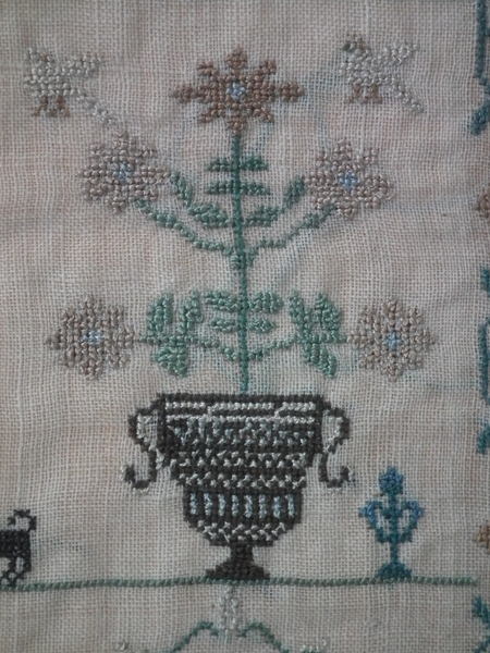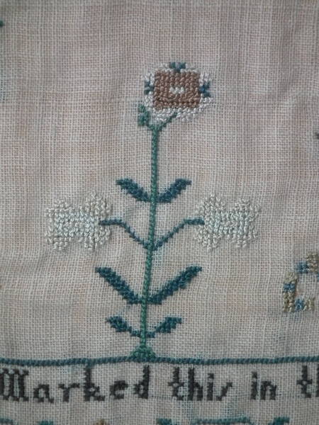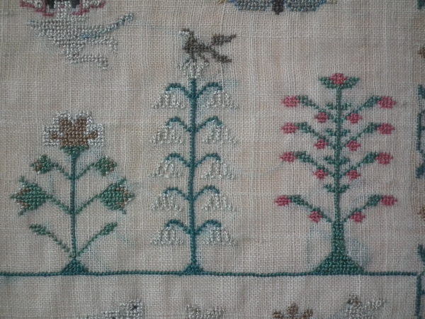 The sampler is worked in silk on linen ground, in cross stitch throughout.
