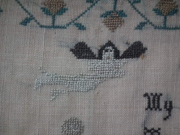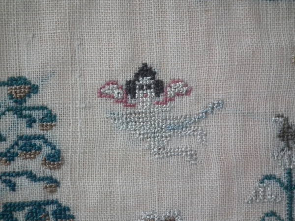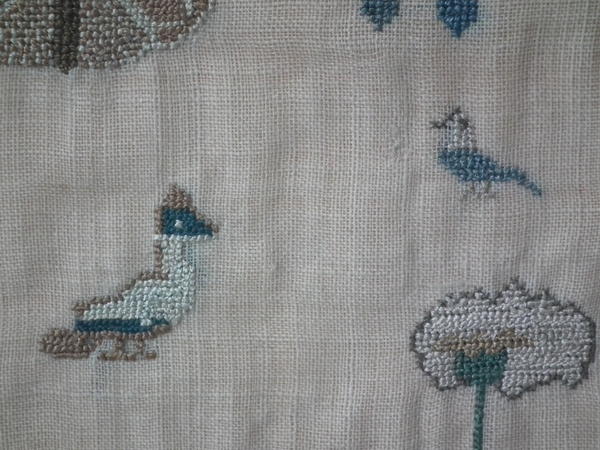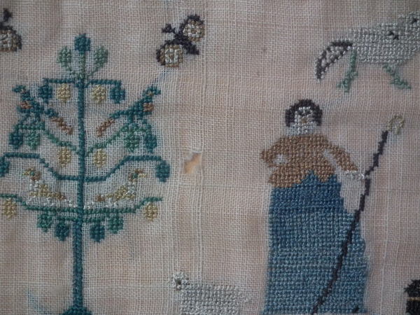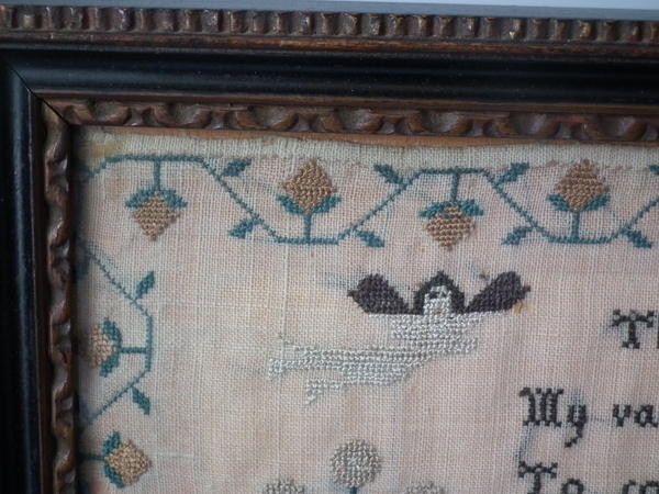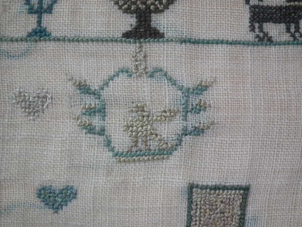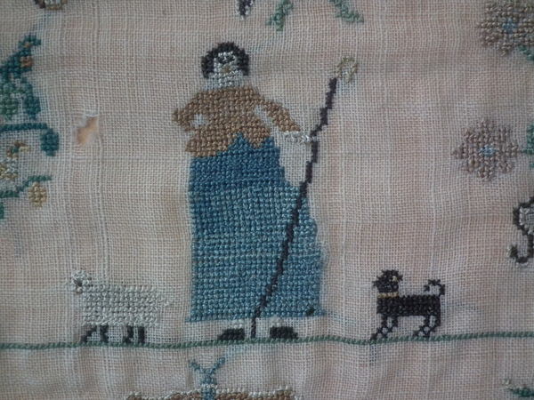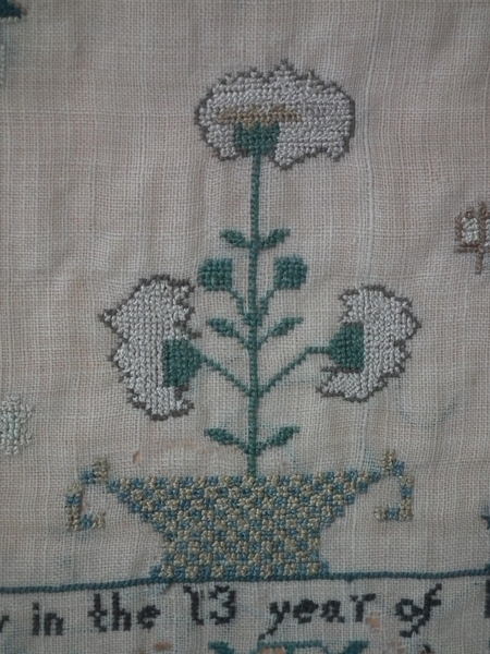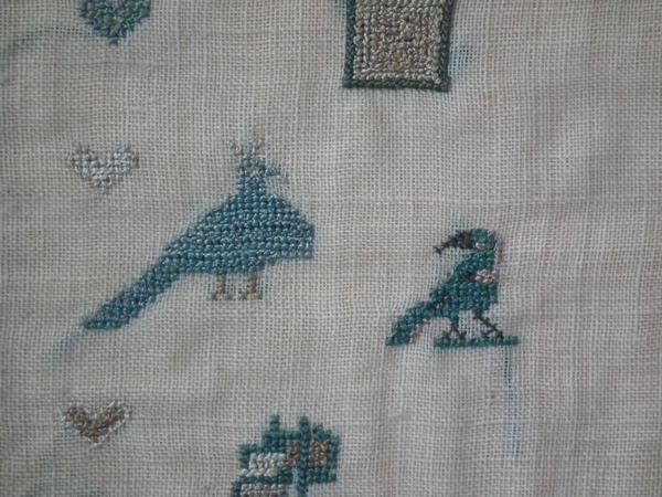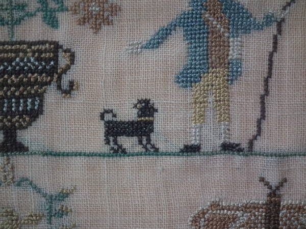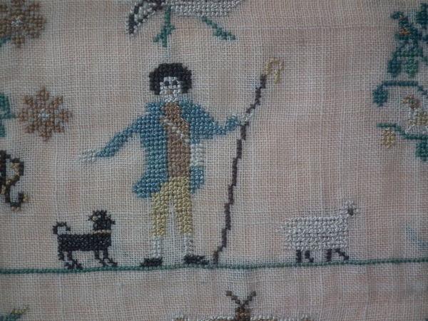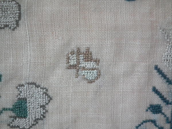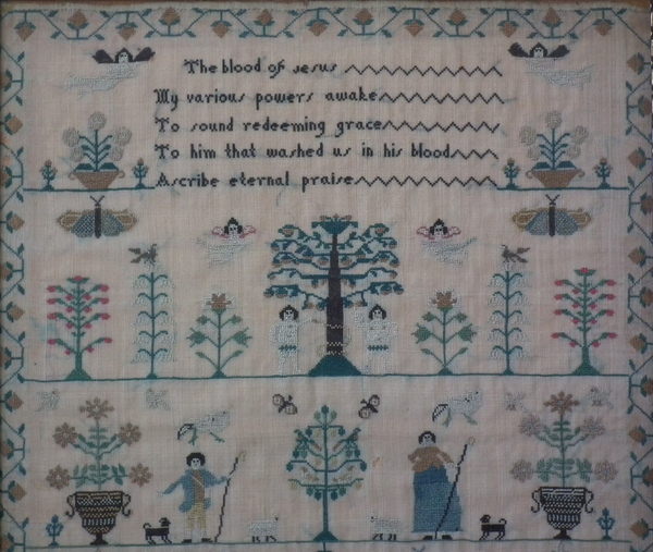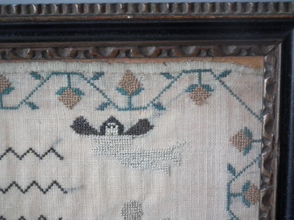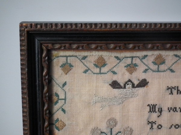 The sampler is worked in silk on linen ground, in cross stitch throughout.