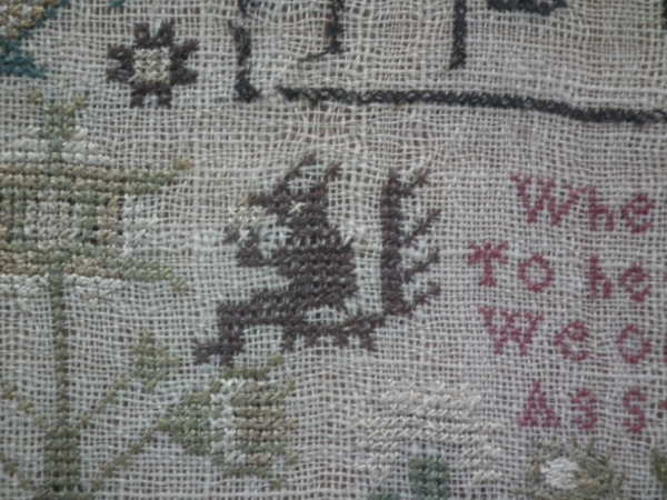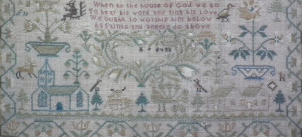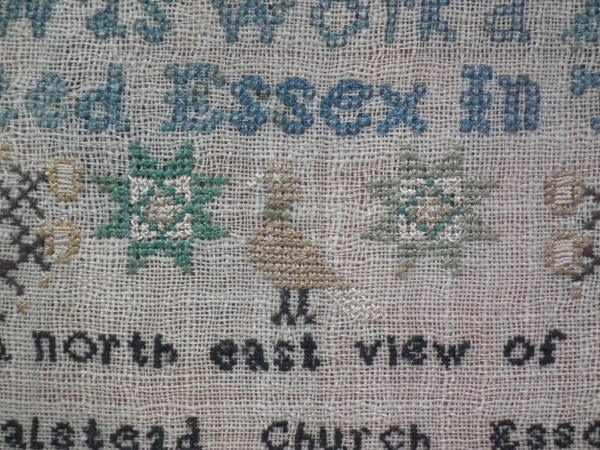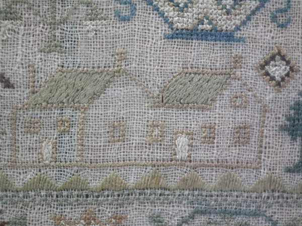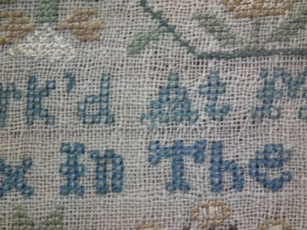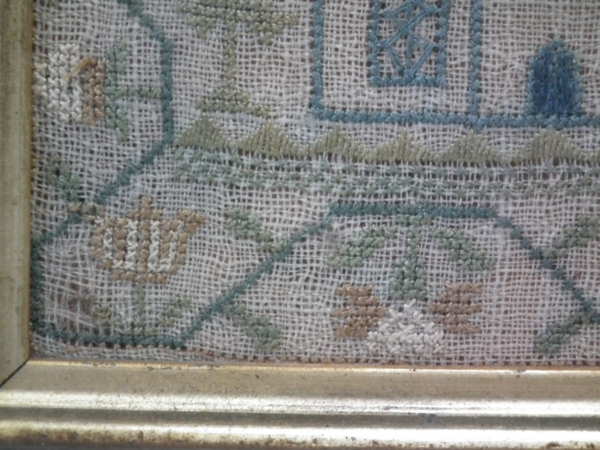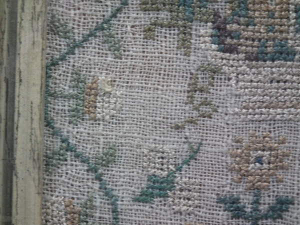 The sampler is worked in silk on linen ground, in a variety of stitches.