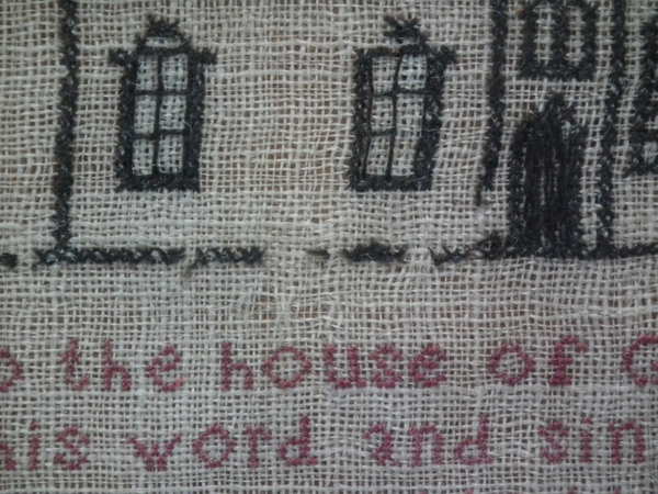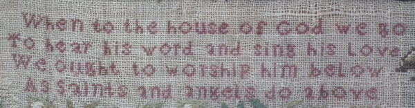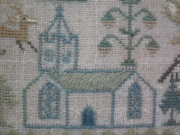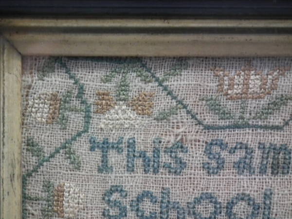 1822 'Halstead Church' School Sampler. Framed in an old wood frame with rippled, old glass.