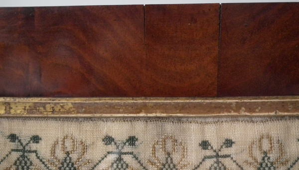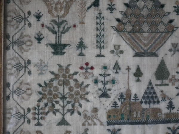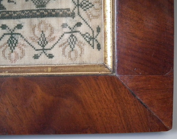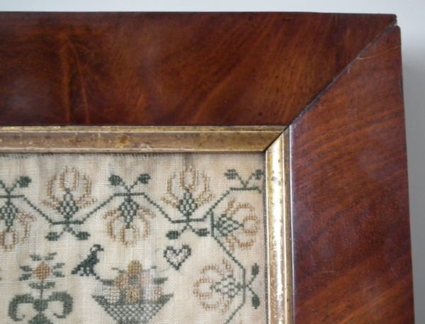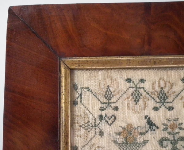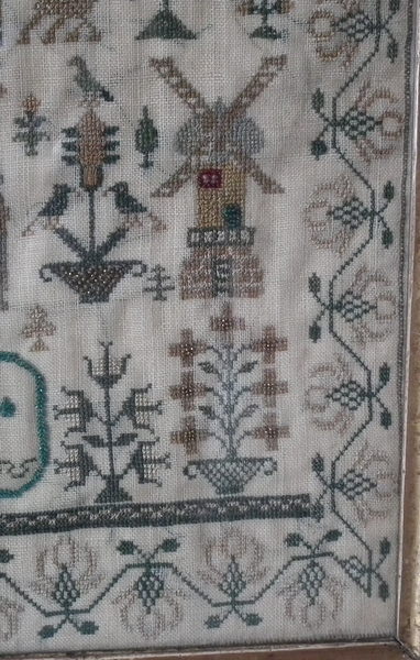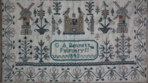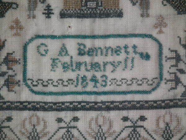 Victorian, dated 1843. 15.75ins by 12.5ins wide. 1843 Beadwork Sampler by G A Bennett. Framed in an old wood frame with rippled, old glass.