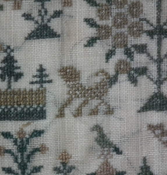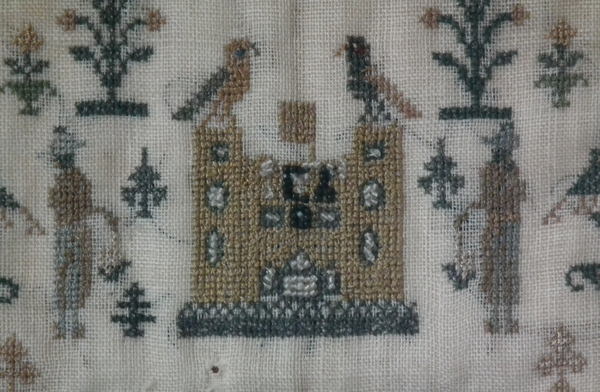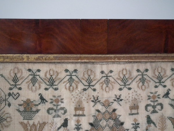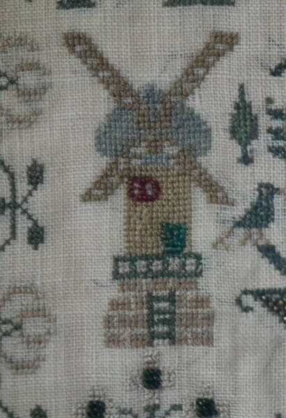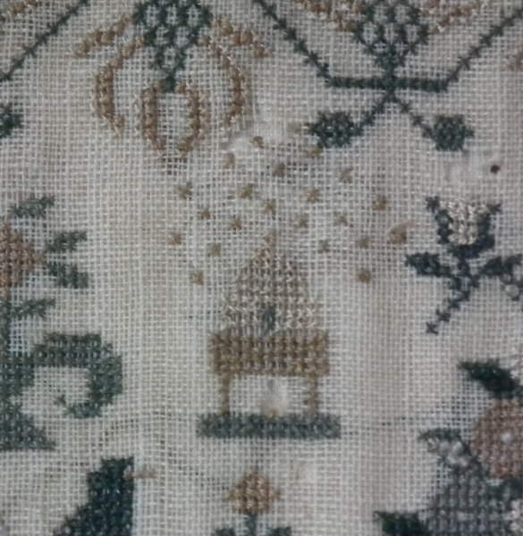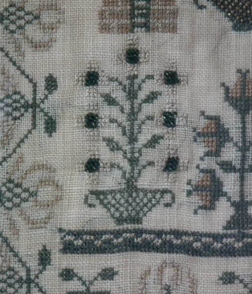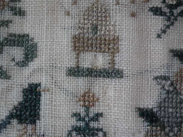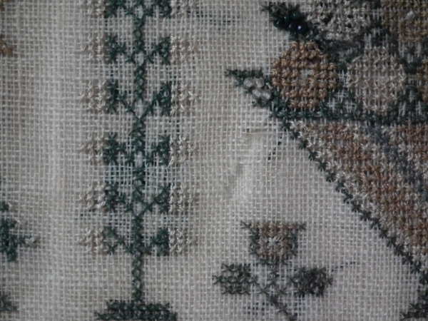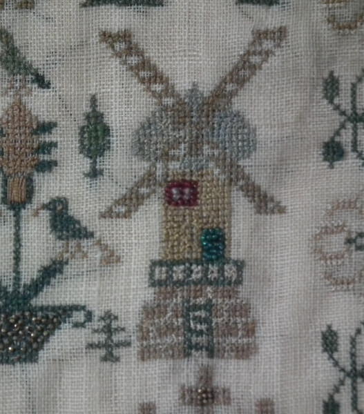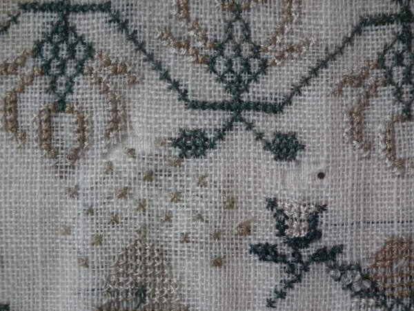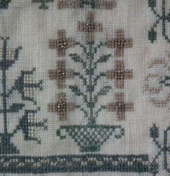 The sampler is worked in silk and coloured beads on linen ground, in a variety of stitches.