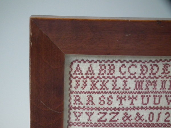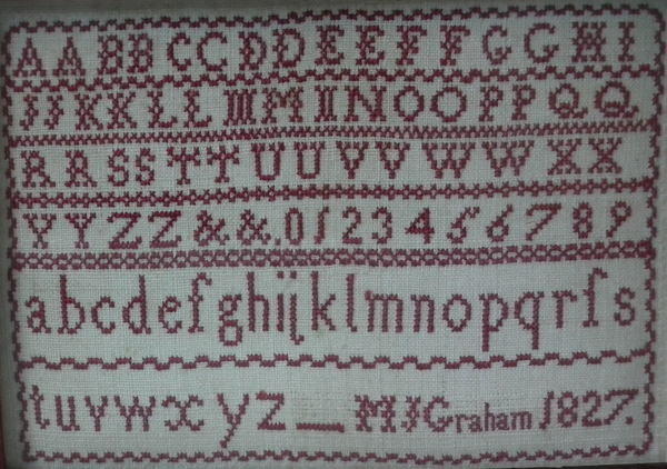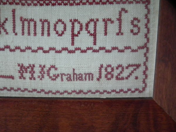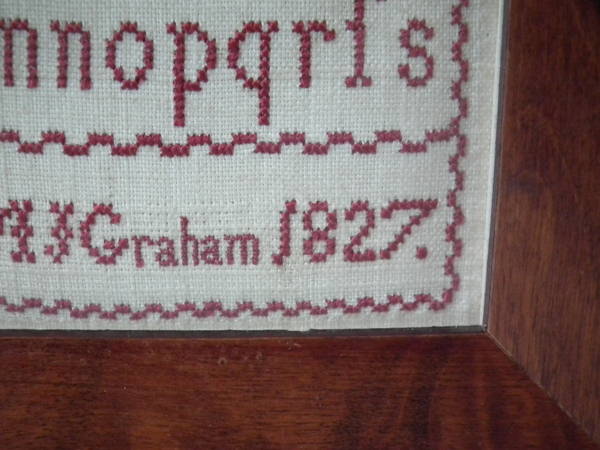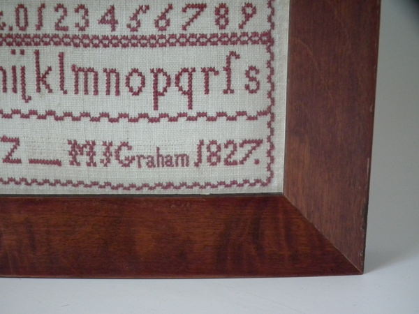 George IV, dated 1827. 3ins by 4.25ins wide. Small 1827 Sampler by M J Graham. Framed in an old wood frame with rippled, old glass.