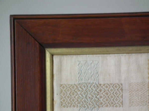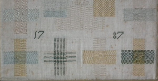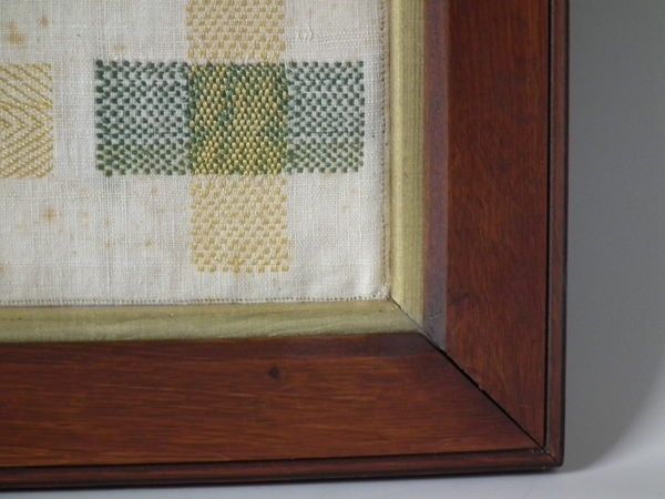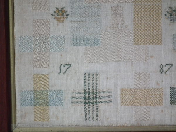 George III, dated 1787. 17.5ins by 16ins wide. 1787 Dutch Darning Sampler. Framed in an old wood frame with gilt slip and glass.