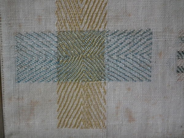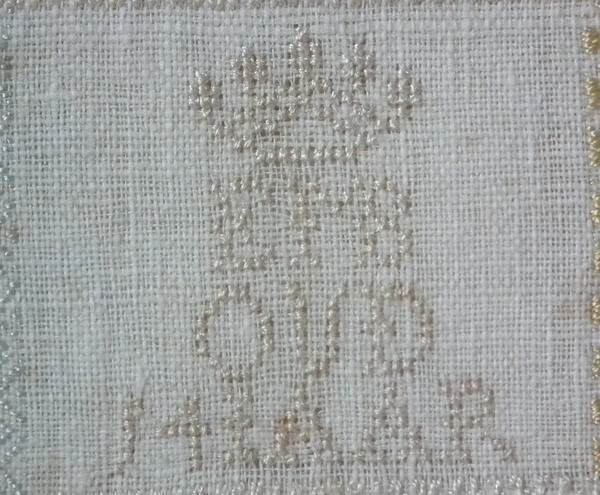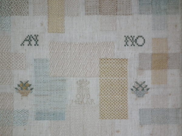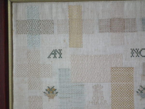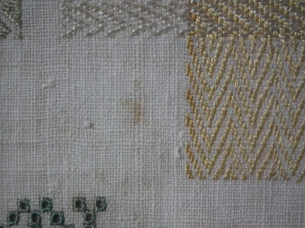 The sampler is worked in silk on linen ground, in a variety of stitches including Algerian eye.