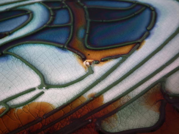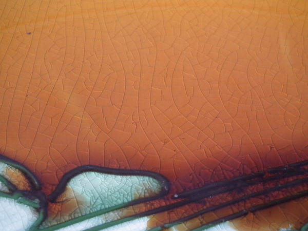 Turqoiuse, blue and orange ground, with green and brown tube lining. Stylised flowers in a typical Art Nouveau design.