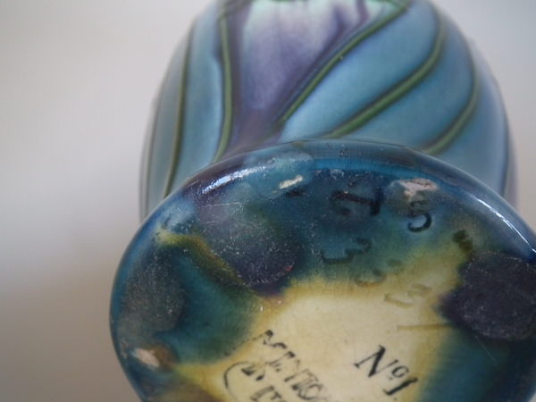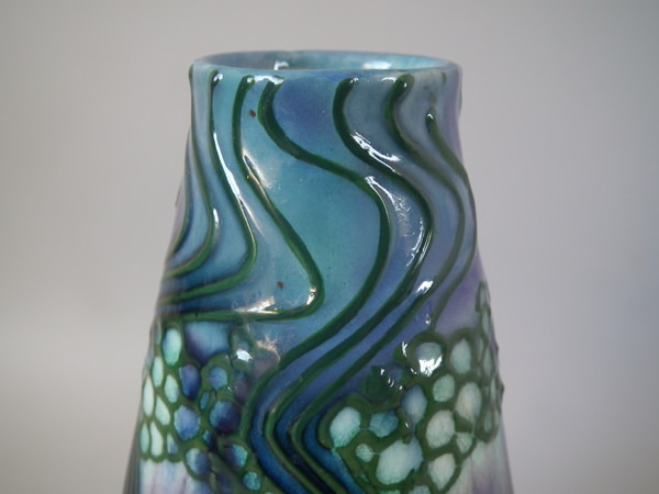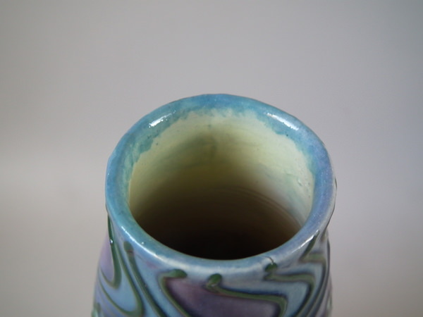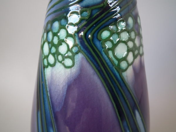 Circa 1910. 9.5ins high by 3.5ins wide. Minton Secessionist No.1 vase. Wave effect tube linings in dark green with blue glaze inbetween. Purple glaze to ground with further 'bubble' effect tube linings in dark green running around vase in two bands with cream glaze inside.