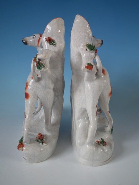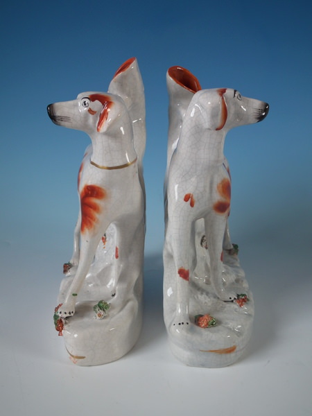 Victorian, circa 1860. Tallest is 8.9ins high, 7.3ins wide, 3ins depth. Pair of Staffordshire spill vases with a hunting theme which feature a foxhound, stood on a shaped base.