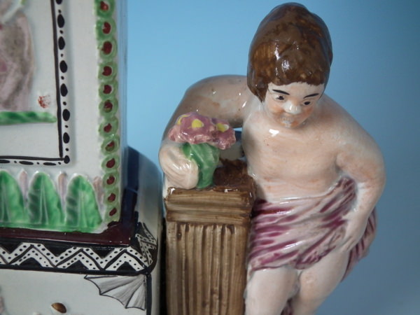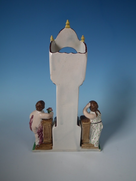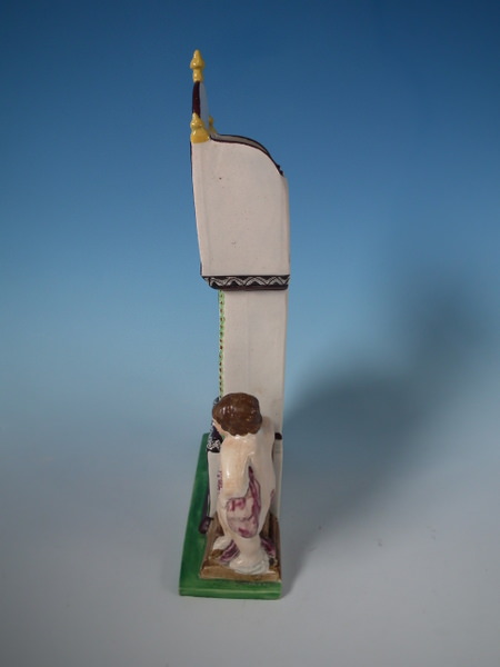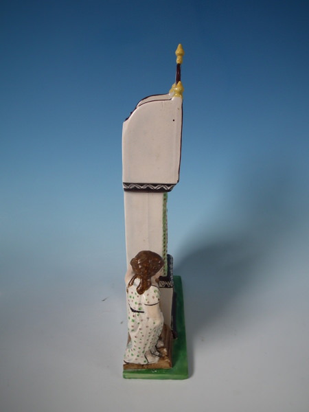 Staffordshire pearlware watch holder with a religious theme which features a long case clock with a man and woman on either side, stood on a rectangular base.