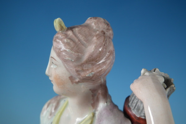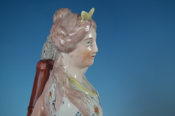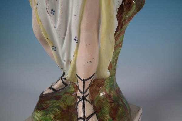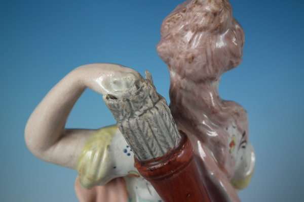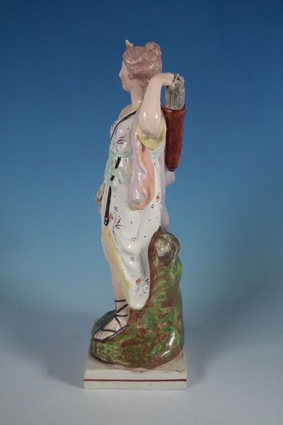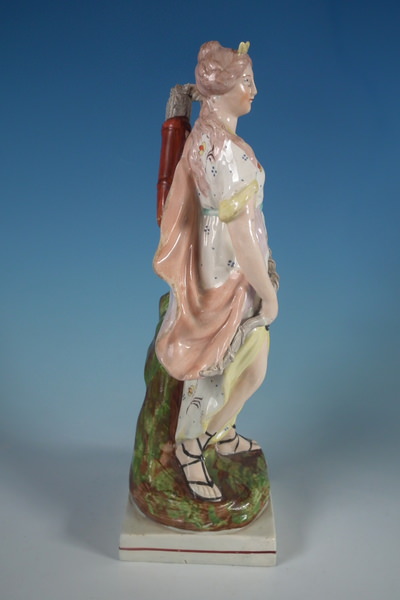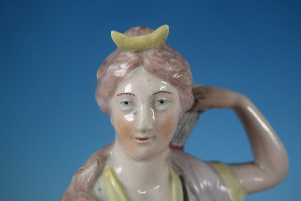 pre-Victorian, circa 1820. 11.8ins high, 4.7ins wide, 3.7ins depth. Staffordshire pearlware figure with a mythological theme which features Diana,