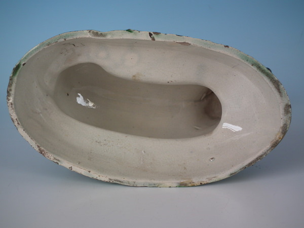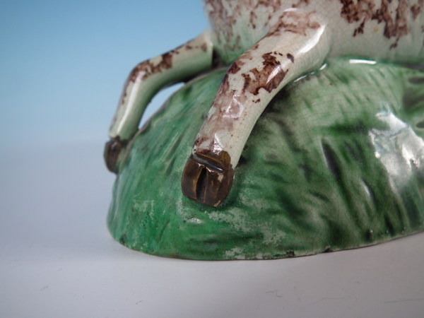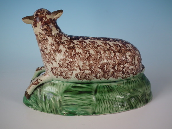Pre-Victorian, circa 1820. 4.7ins high, 6.7ins wide, 3.5ins depth . Staffordshire pearlware figure which features a sheep, recumbent on a shaped hollow base.