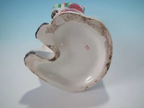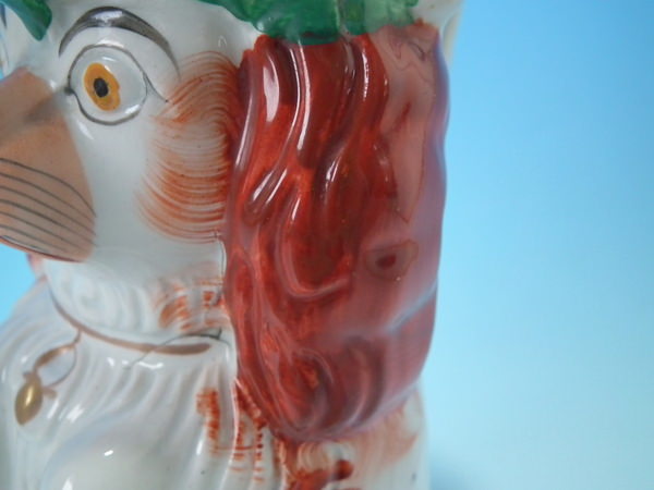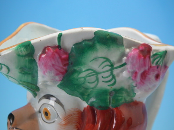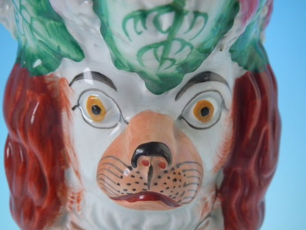 Staffordshire jug/pitcher which features a begging spaniel modeled with tricorn hat, floral decoration and ochre line around rim, stood directly on the ground, no base.