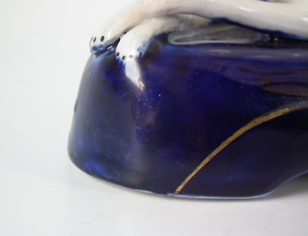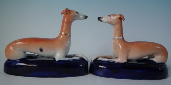 Pair of Staffordshire inkwells which feature a greyhound, recumbent on a cobalt blue base.