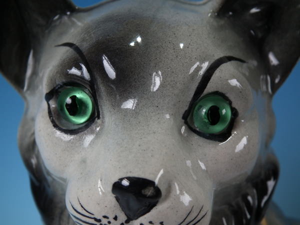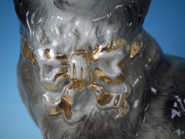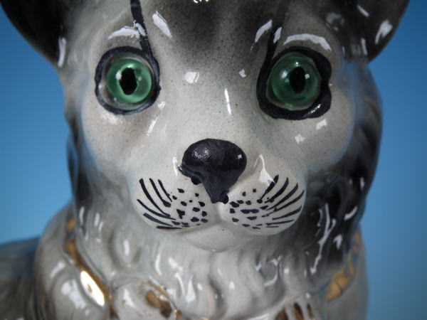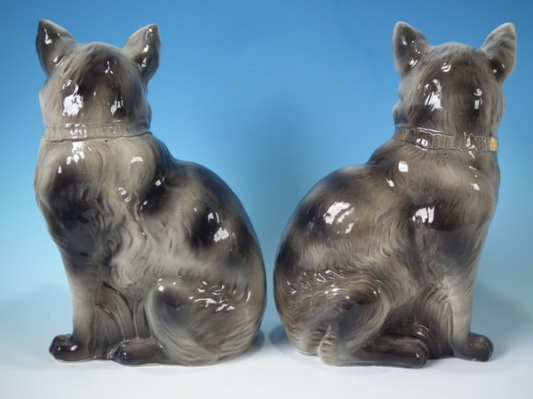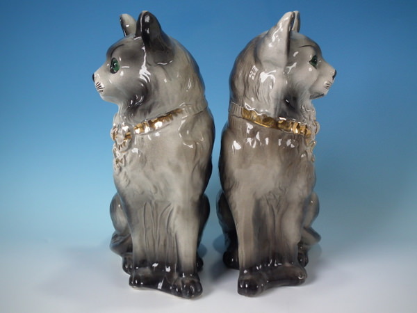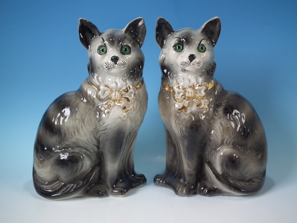 Edwardian, circa 1910. Tallest is 12.2ins high, 7.9ins wide, 4.7ins depth. Pair of Bo'ness Staffordshire figures which feature a cat with glass eyes, seated directly on the ground, no base. Grey version. Bright gilt embellishment. Decorated 'in the round' - decoration to front and reverse.