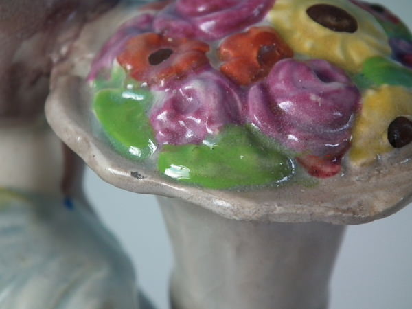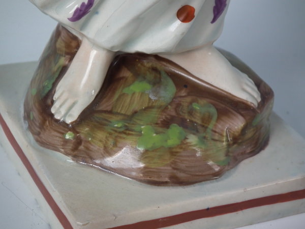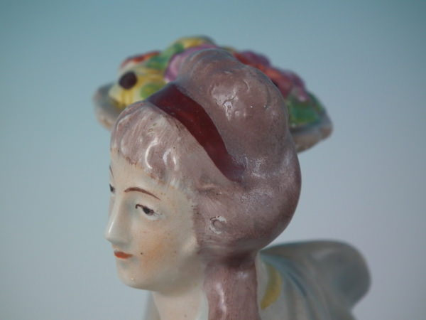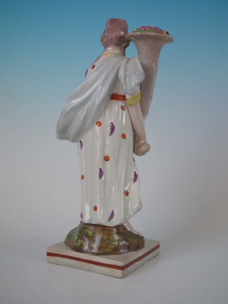 Staffordshire pearlware figure which features a lady wrapped in a shawl, holding a cornucopia of flowers, stood on a square base.