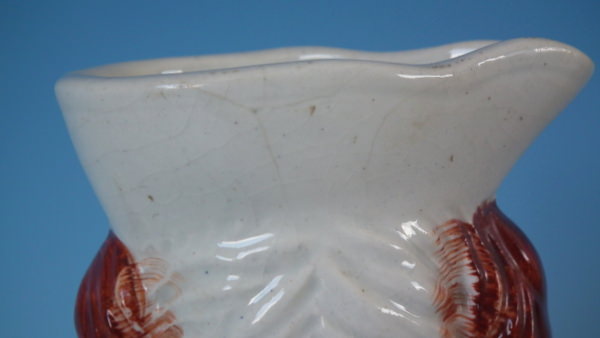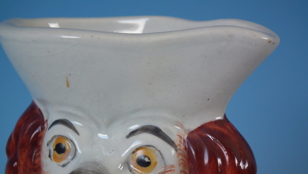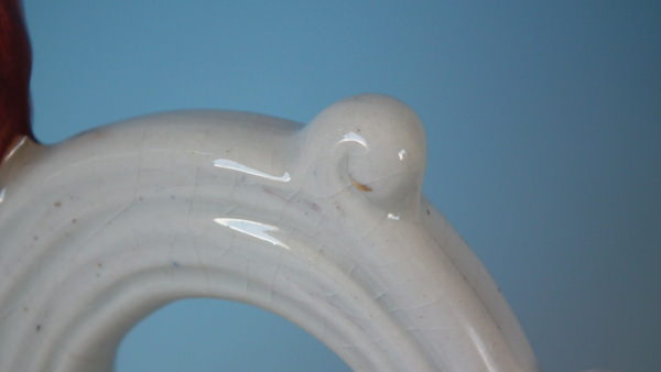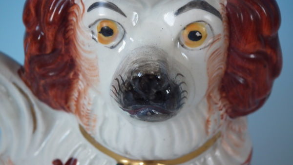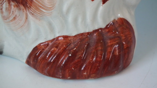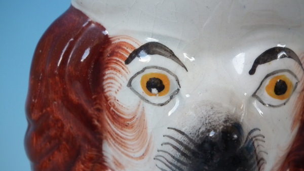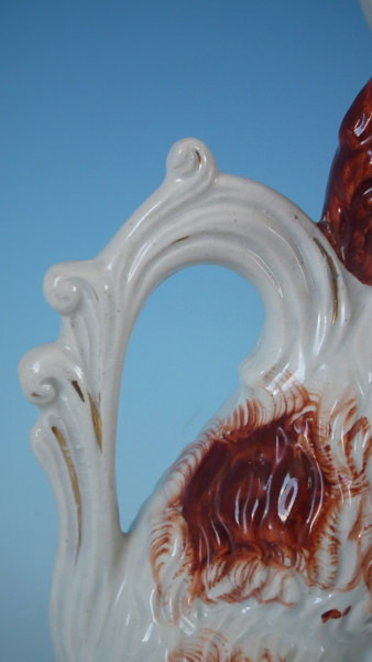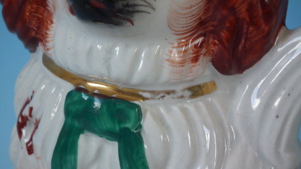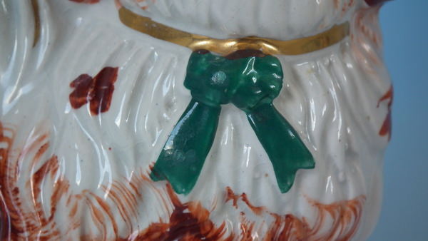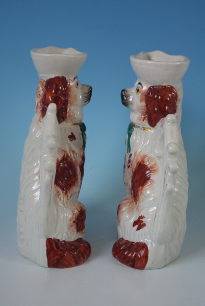 Pair of Staffordshire jug/pitchers which feature a spaniel with a bow, seated directly on the ground, no base.