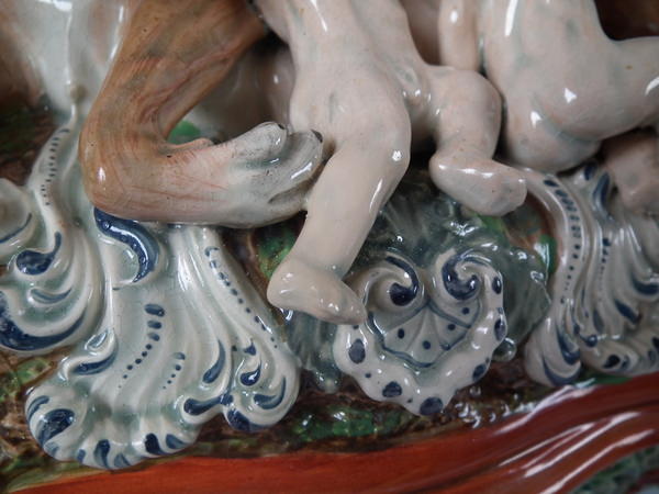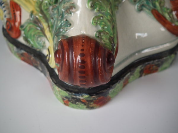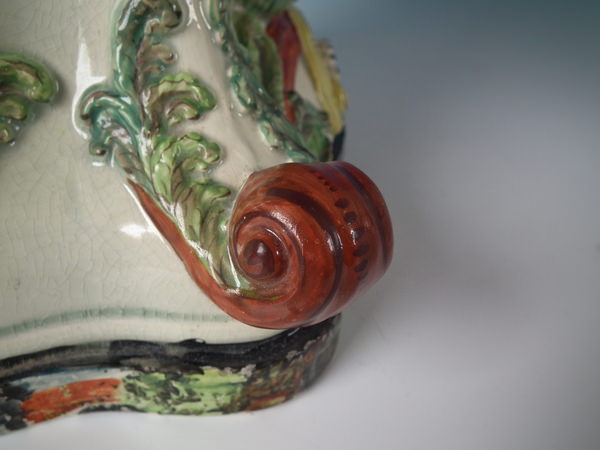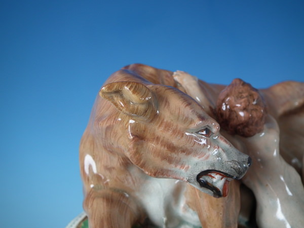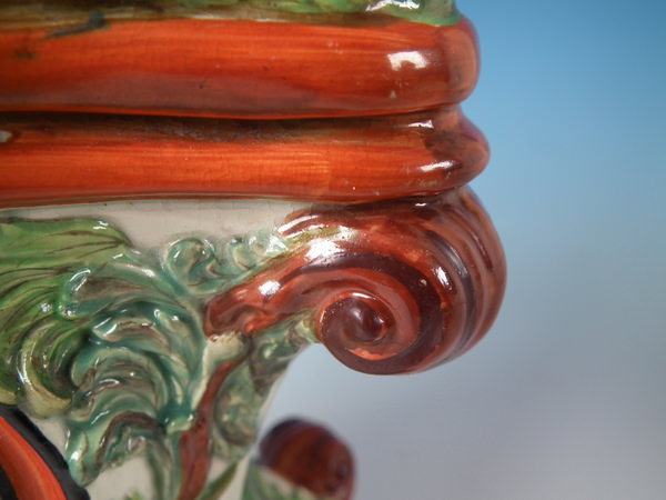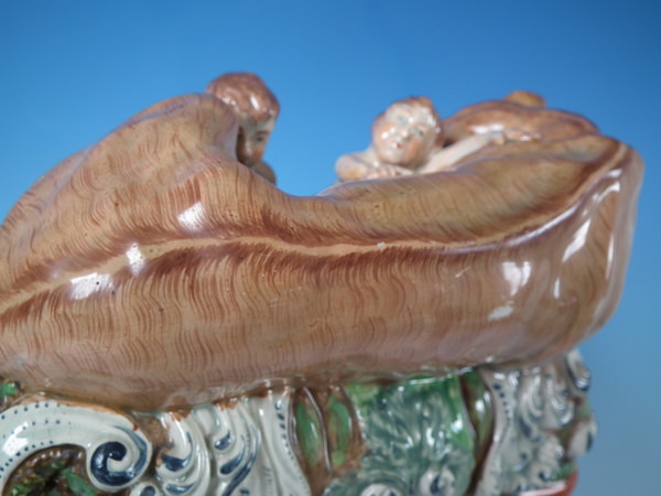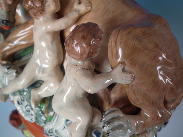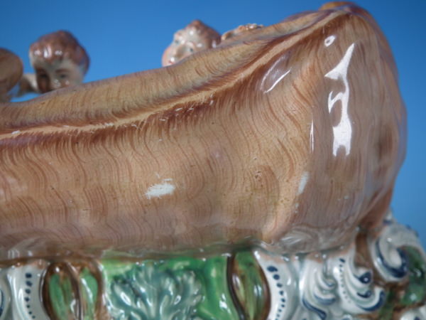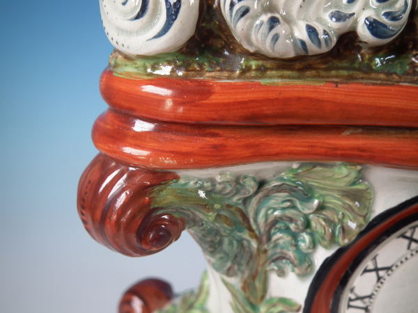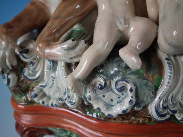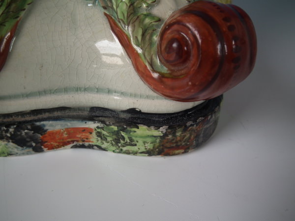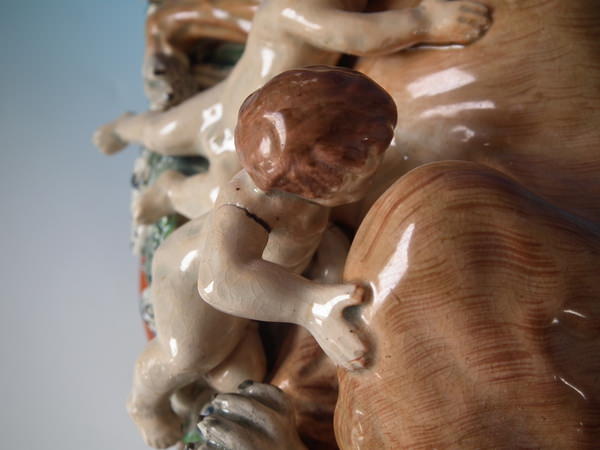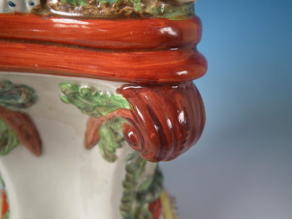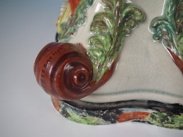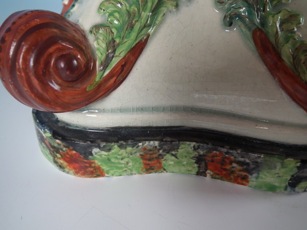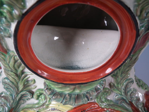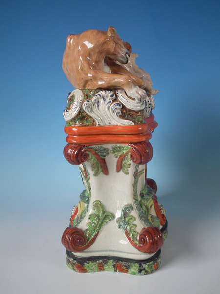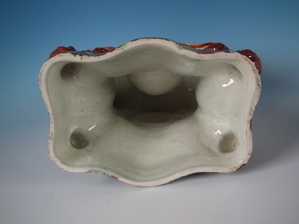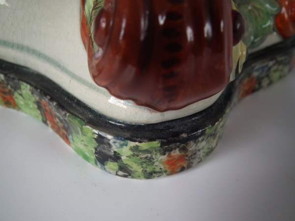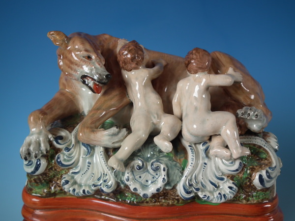 pre-Victorian, circa 1820. 11.4ins high, 8.7ins wide, 5.9ins depth. Staffordshire pearlware watch holder with a mythological theme which features Romulus and Remus with a she-wolf,
