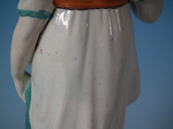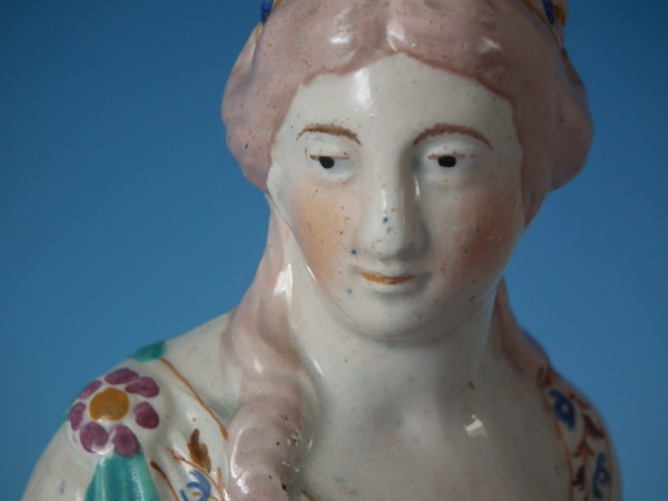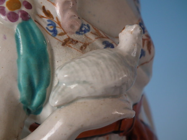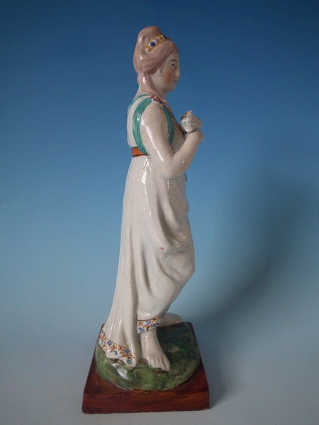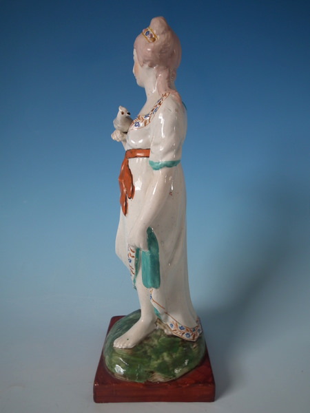 pre-Victorian, circa 1820. 10.2ins high, 3.5ins wide, 3.5ins depth. Staffordshire pearlware figure with a mythological theme which features a lady holding a dove, stood on a square base. Multi-coloured version.