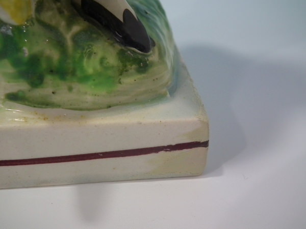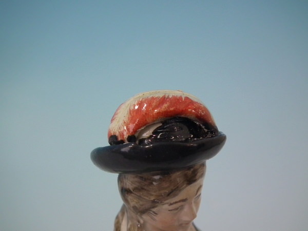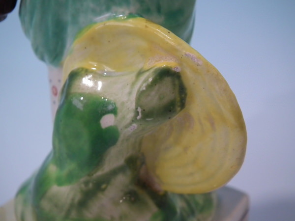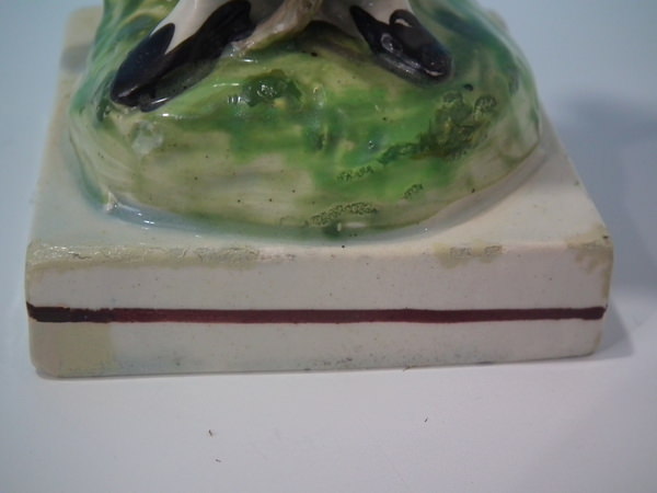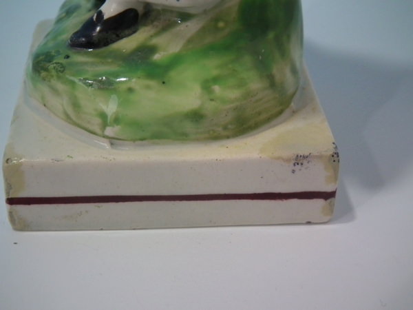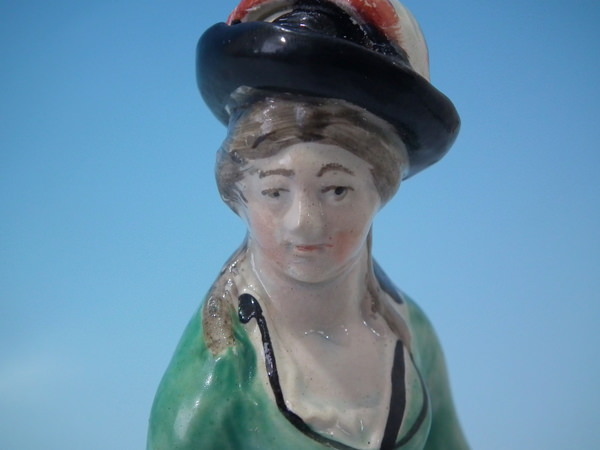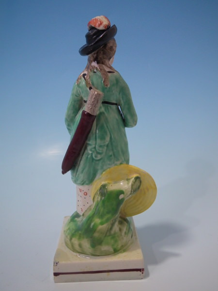 pre-Victorian, circa 1820. 7.5ins high, 3.1ins wide, 2.8ins depth. Staffordshire pearlware figure with a hunting theme which features a female archer, stood on a plinth base. Multi-coloured version.