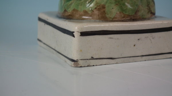 pre-Victorian, circa 1820. 6.4ins high, 2.2ins wide, 2.2ins depth. Staffordshire pearlware figure embematic of water which features a fisherwoman holding fish in the folds of her skirt, stood on a square base.